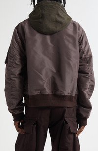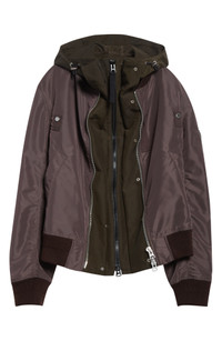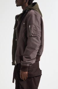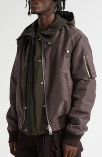 Chitose Abe's signature blending of opposing aesthetics shines through the layered illusion of this mixed-media jacket that fuses the look of a classic bomber with a zip hoodie. Two-way front-zip closure Drawcord-toggle hood Front welt pockets; sleeve zip pocket Lined 100% nylon with 60% nylon, 40% acrylic and 53% acrylic, 53% wool, 10% polyester contrasts Dry clean Imported Designer Clothing Asian & Pacific Islander Owned/Founded