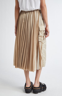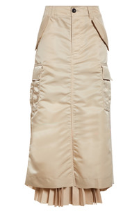The division of duties is clearly designed into this midi skirt tailored with an all-function nylon-twill cargo front and an all-fashion pleated satin back. 34" length (size 3) Zip fly with button closure Front flap-slant pockets; cargo bellows pockets Back elastic waist Cupro lining, with 100% polyester fill 100% nylon with 100% polyester trim Dry clean Made in Japan Designer Clothing Asian & Pacific Islander Owned/Founded