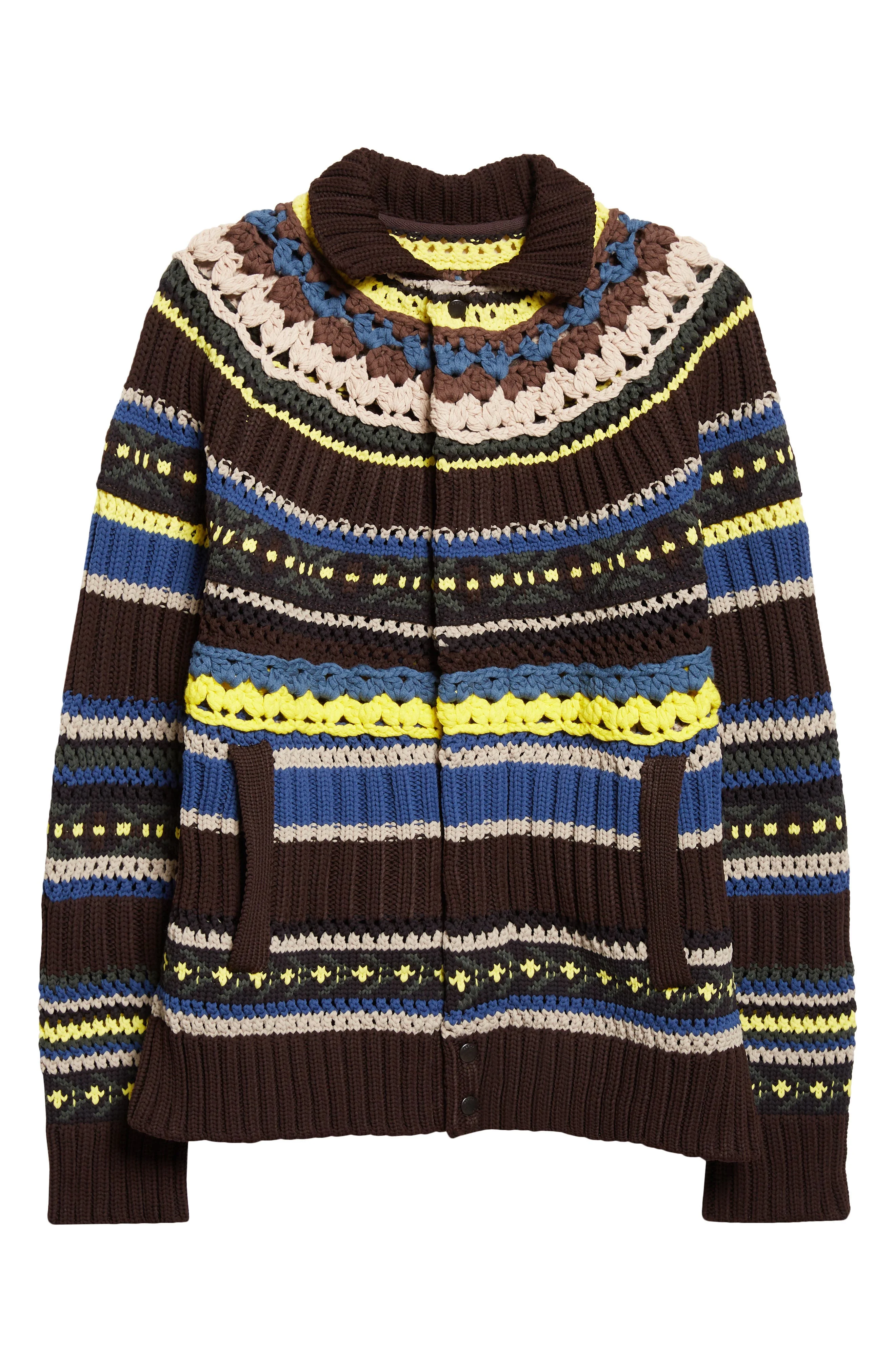 Chitose Abe's penchant for artfully mismatched aesthetics shines through the dramatically mixed stitches and varied colors of this artisanal cardigan. Front button closure Spread collar Long sleeves Front welt pockets Polyester/cotton/acrylic Dry clean Imported Designer Clothing Asian & Pacific Islander Owned/Founded
