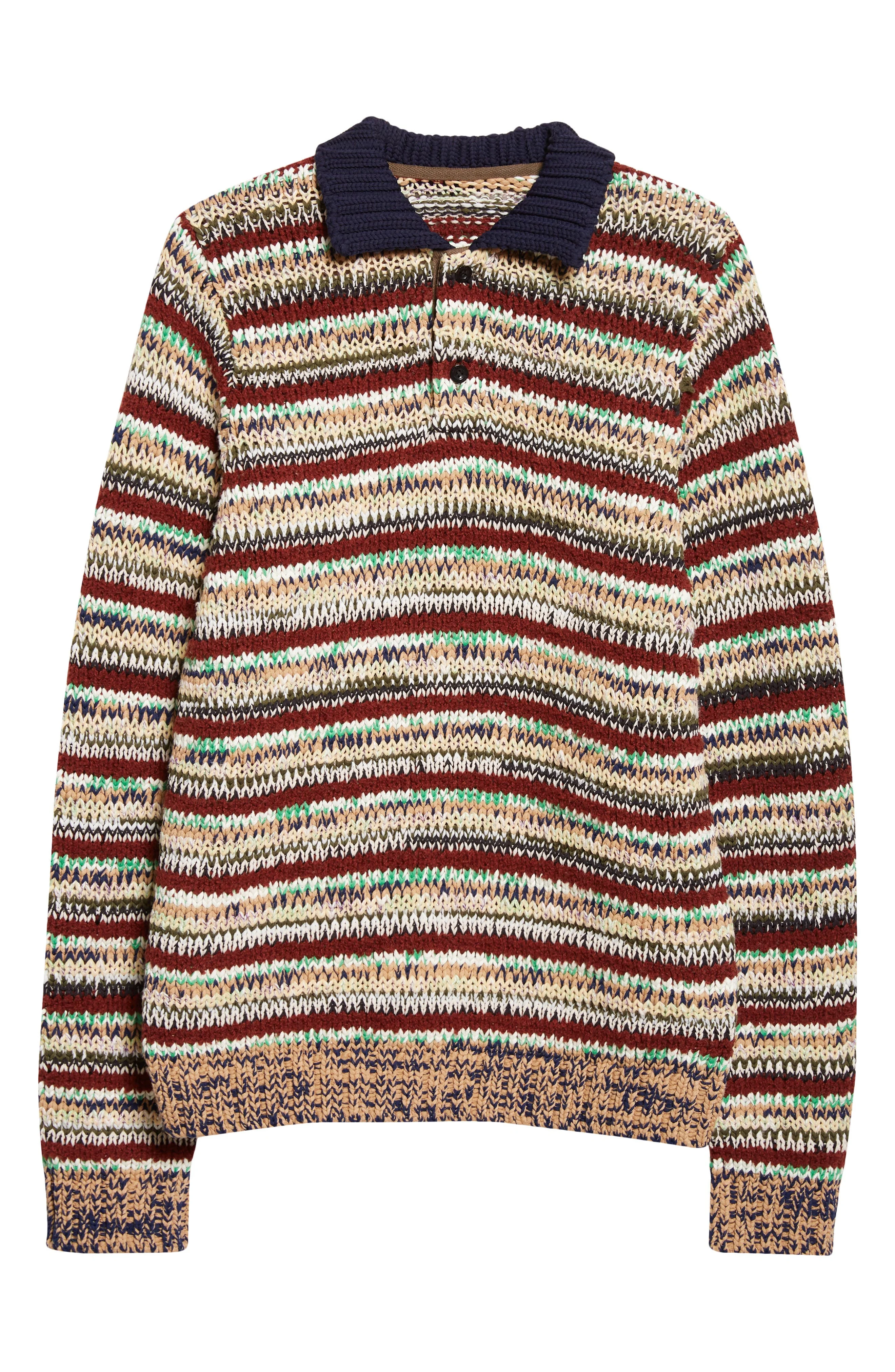 Chitose Abe's penchant for artfully mismatched aesthetics shines through the variegated knit stripes and varied colors of this soft cotton-blend polo-sweater. Button half placket Spread collar Long sleeves 64% cotton, 34% polyester, 2% acrylic Dry clean Imported Designer Clothing Asian & Pacific Islander Owned/Founded
