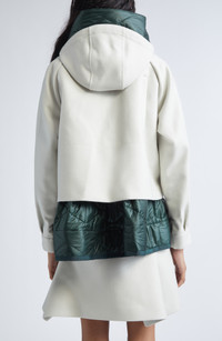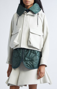Chitose Abe's passion for hybrid aesthetics shines through the abbreviated melton wool body contrasted by the longer diamond-quilted lining and hood of this mixed-media jacket cut in a billowed blouson silhouette. Front zip closure with snap storm placket Drawstring hood Button cuffs Front bellows pockets Lined, with 100% polyester fill 100% wool with 100% nylon contrast Dry clean Made in Japan Designer Clothing Asian & Pacific Islander Owned/Founded