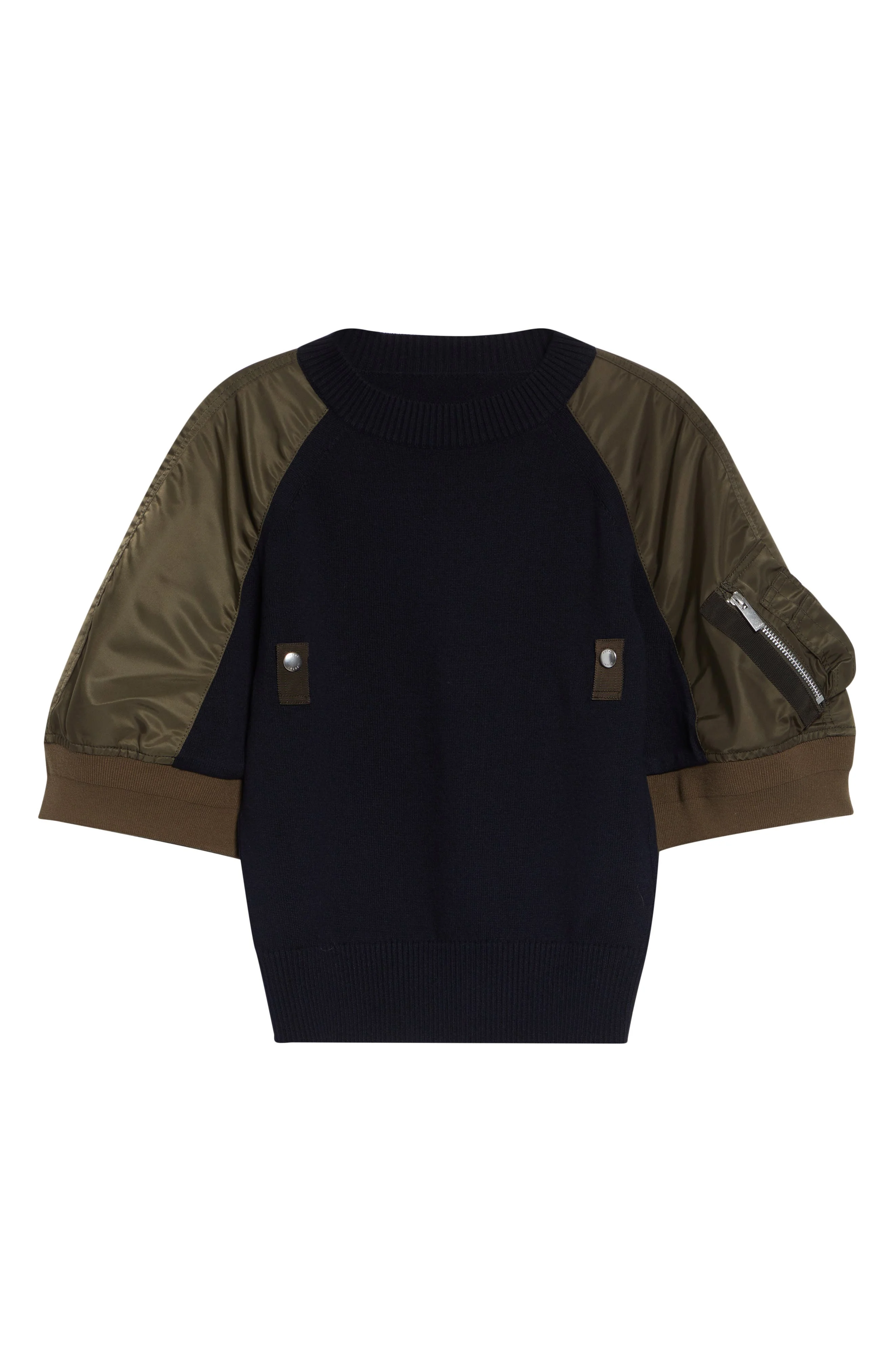 Chitose Abe employs her hybridized wizardry to create this cotton‑rich sweater with jacket aspirations manifested via lightly insulated nylon‑twill panels and utilitarian accents borrowed from bomber styles. Crewneck Short sleeves Ribbed cuffs and hem Sleeve zip pocket Lined, with synthetic fill 54% cotton, 346% polyester with 100% nylon and 55% polyester, 44% cotton, 1% polyurethane contrasts Dry clean Imported Designer Clothing Asian & Pacific Islander Owned/Founded