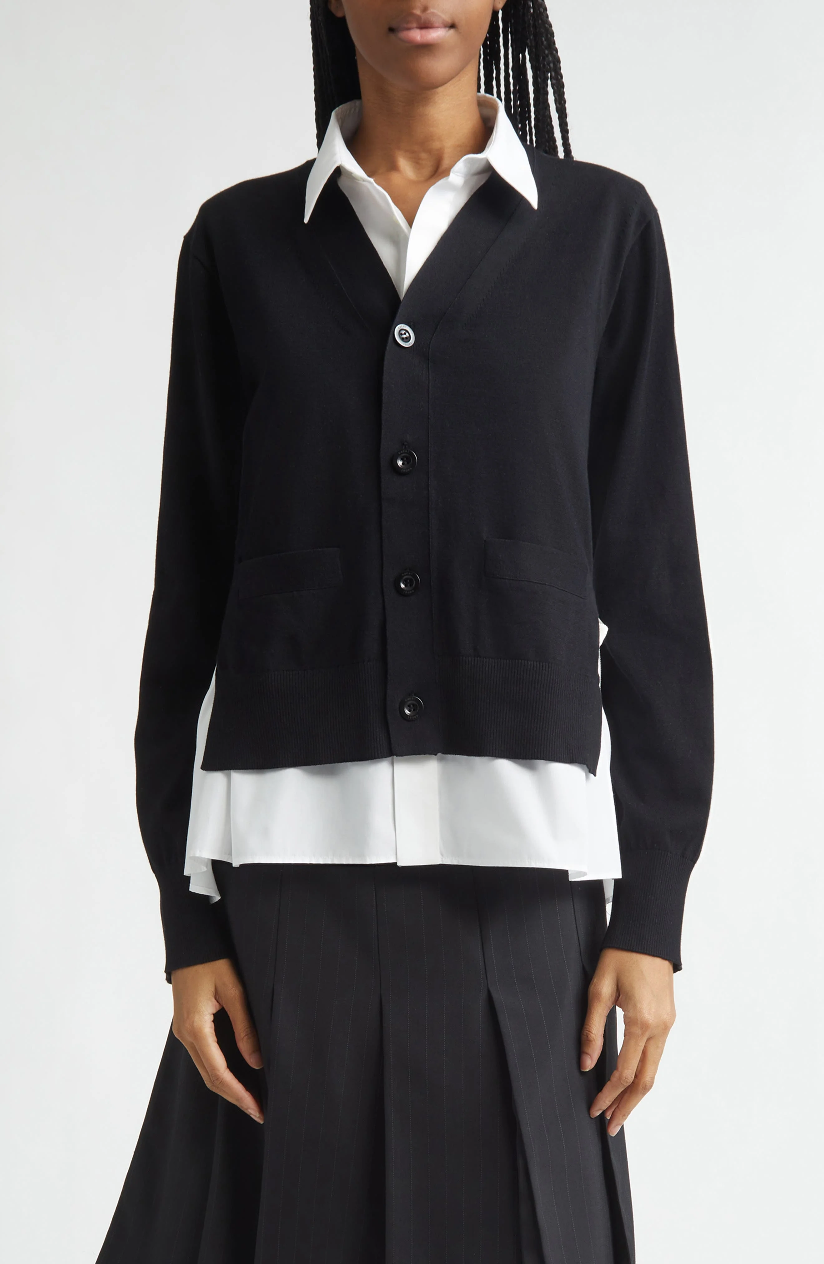 Sacai Mixed Media Poplin & Knit Cardigan in Black/Off White at Nordstrom