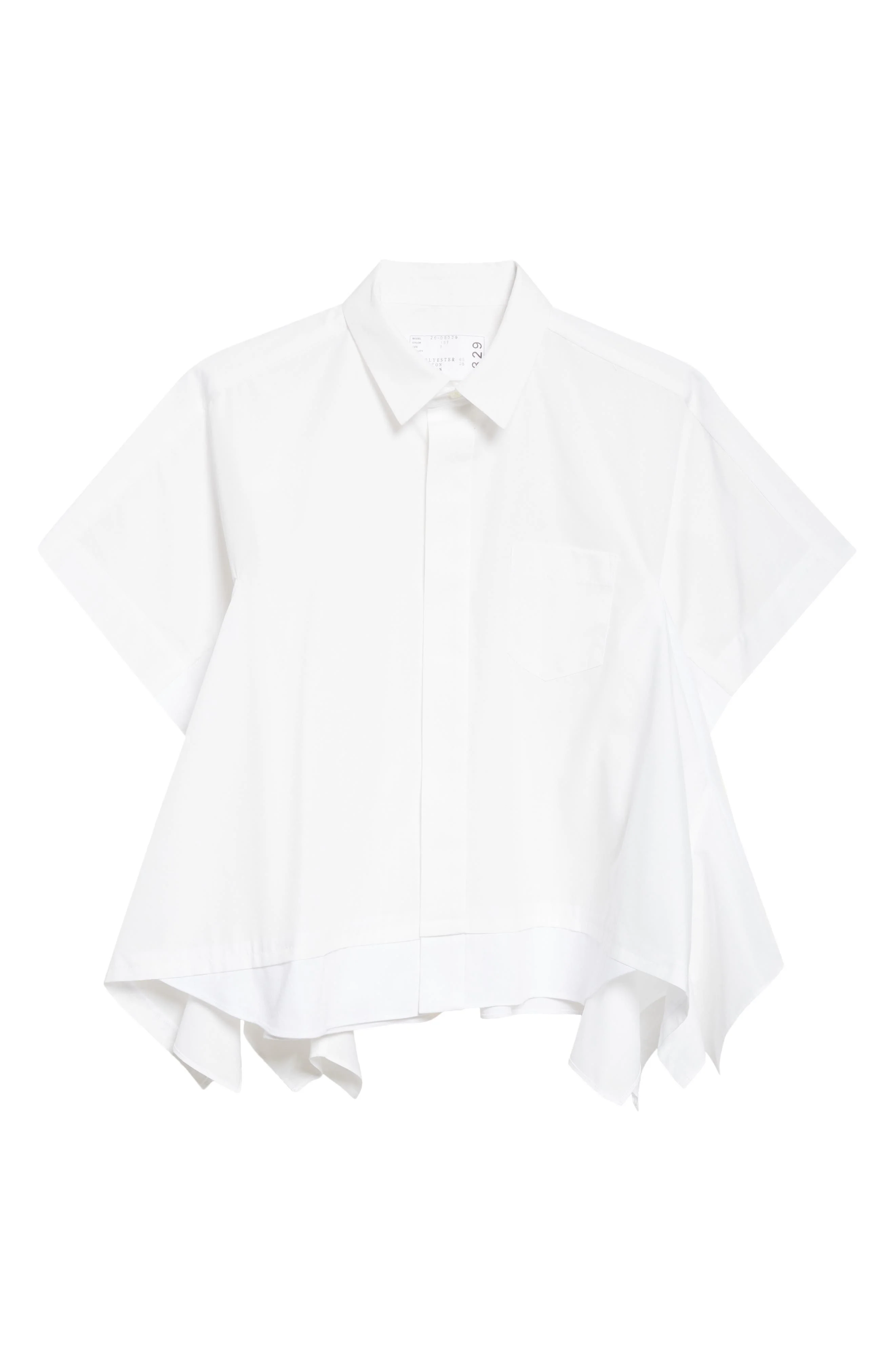 A sharp point collar and short sleeves get a drapey echo at the hankerchief hem of this crisp poplin shirt that offers a sweetened take on workwear. Hidden-button placket Short sleeves 65% polyester, 35% cotton Dry clean Made in Japan Designer Clothing Asian & Pacific Islander Owned/Founded