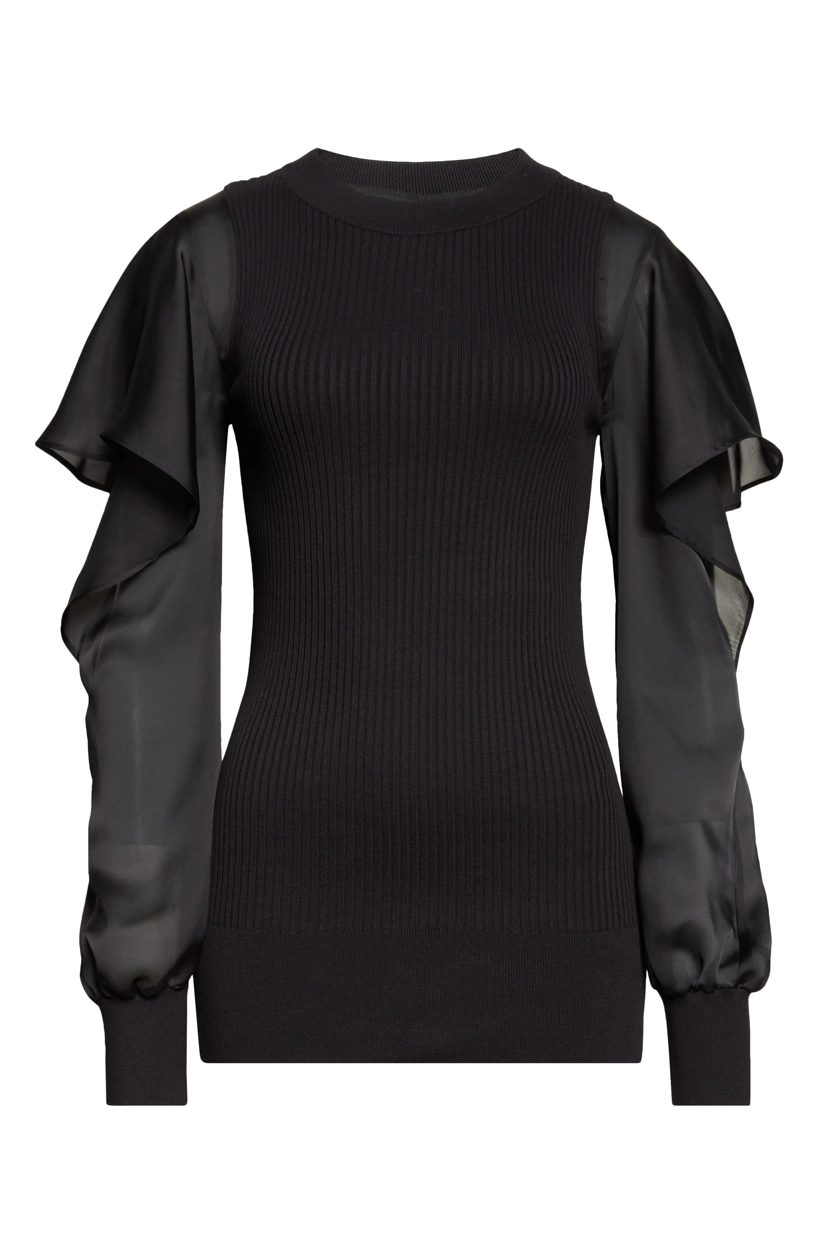 Sweet satin sleeves bring extra romance to a knit cotton pullover with cascading ruffles. Crewneck Long sleeves Ribbed cuffs and hem 100% cotton body with 100% polyester sleeves Dry clean Made in Japan Designer Clothing Asian & Pacific Islander Owned/Founded