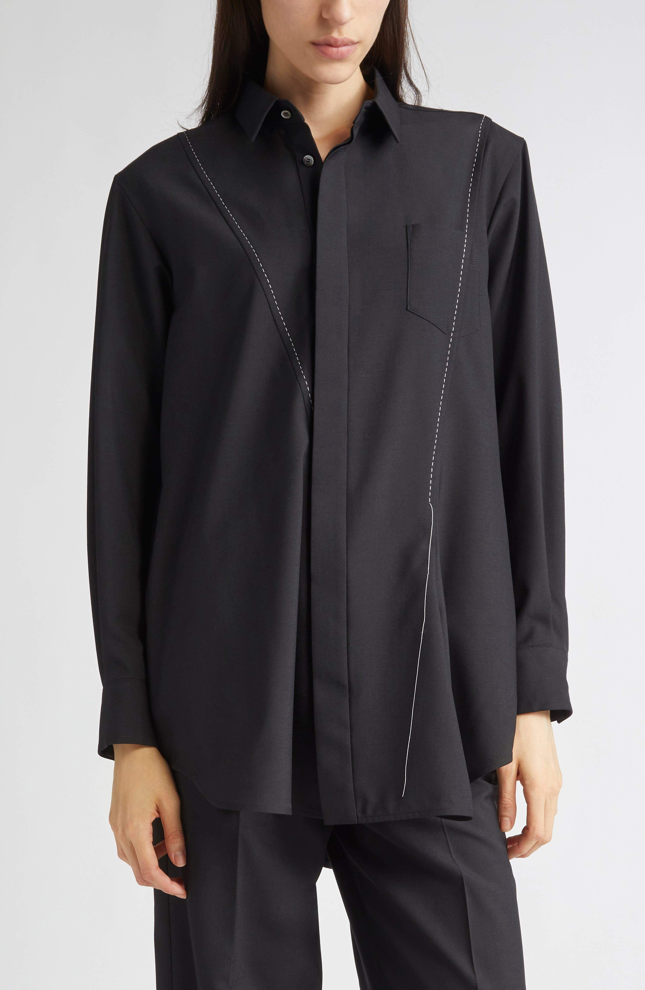 Contrast topstitching highlights the curving, asymmetric seams that give this menswear-style shirt a softer shape and sweeping, tuxedo-like tails. Hidden-button placket Spread collar Long sleeves with button cuffs Chest patch pocket Drop-tail hem 70% polyester, 30% wool Dry clean Made in Japan Designer Clothing Asian & Pacific Islander Owned/Founded