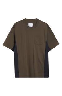 A master of contrarian textures, Chitose Abe employs her technical wizardry to create this hybridized pocket T-shirt that combines soft cotton jersey and spliced panels wool-enriched suiting fabric into one bold statement. Crewneck Short sleeves Chest patch pocket 100% cotton, with 70% polyester, 30% wool contrast Dry clean Made in Japan Designer Clothing Asian & Pacific Islander Owned/Founded