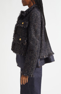 Chitose Abe employs her signature splicing technique to create this hybrid style that layers a fringe-trimmed boxy tweed jacket over a classic denim trucker style. Front button closure Spread collar Chest button-flap pockets; front button-flap pockets Adjustable button side tabs 80% wool, 13% acrylic, 6% nylon Dry clean Made in Japan Designer Clothing Asian & Pacific Islander Owned/Founded