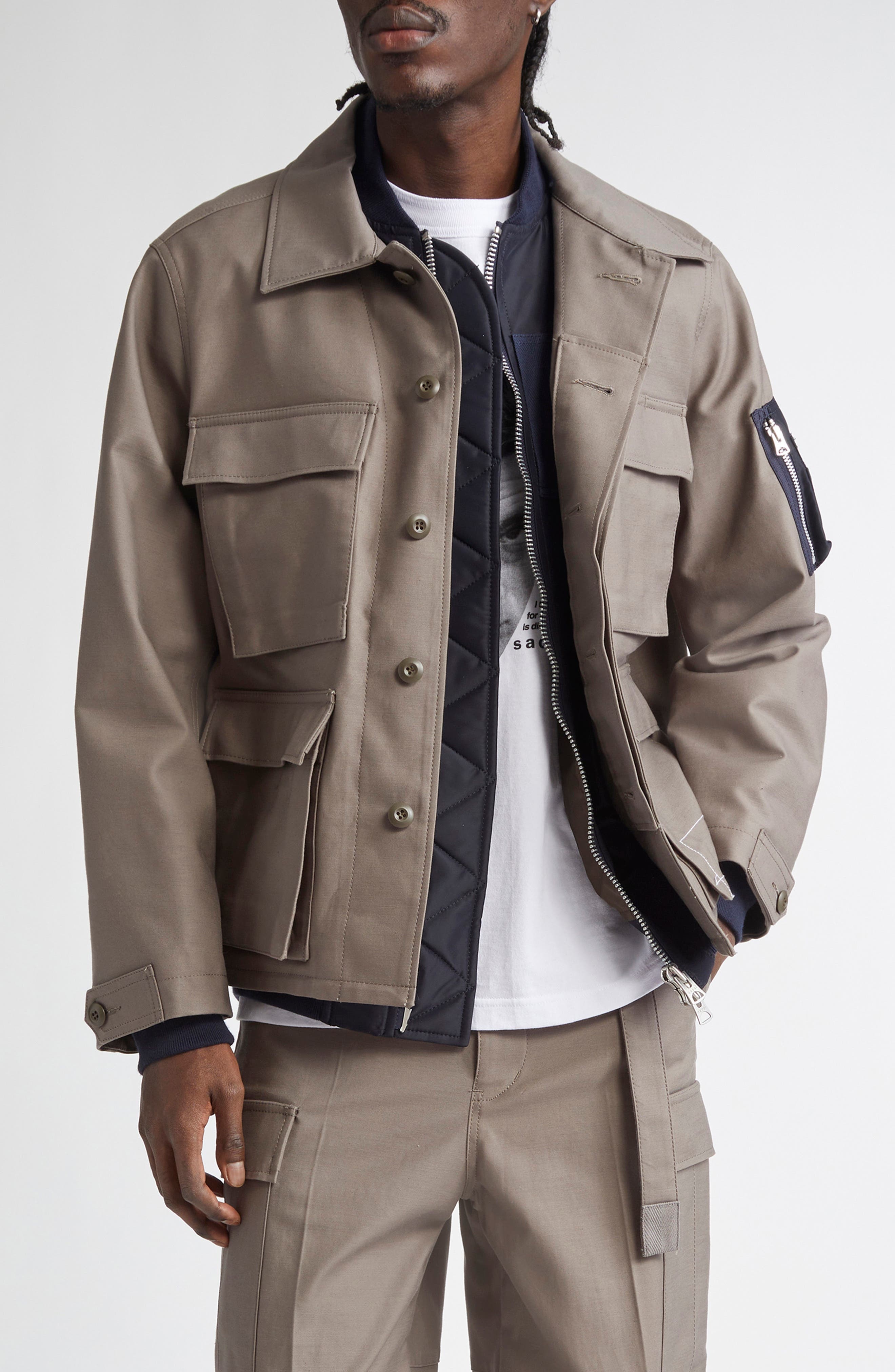 Japanese brands sacai and WTAPS have come together for the first time for an exclusive collaboration.The capsule collection features a well-worn aesthetic in utilitarian design that follows basic military shapes. Tying together both brands’ unique motifs, the garments follow WTAPS’s workwear fabrics with sacai’s use of satin. Merging each brand’s typical structures and designs, intricately amalgamated techniques give a perfect combination of both DNAs. An added feature sees the brand tag stitched with a single white thread, a nod to WTAPS' MILL series.A bomber-like jacket silhouette, featuring corduroy collars for the added workwear aesthetic fuses WTAPS bold utilitarian edge with sacai's signature hybrid aesthetic in this runway-featured essential boasting an inset bomber-style bib. Hidden-button placket; inset zip closure Notched collar; inset blade collar Button cuffs Front bellows pockets Lined, with 100% polyester fill 100% cotton Dry clean Made in Japan Designer Clothing Asian & Pacific Islander Owned/Founded