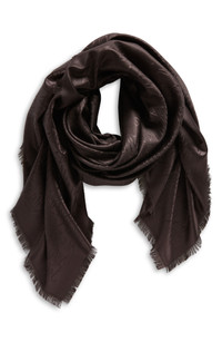Subtly rendered logo lettering fades into partial obscurity on a silk-and-wool scarf finished with the faintest of fringes. 54" x 55 1/2"; 3/4" fringe 63% silk, 37% wool Dry clean Made in Italy
