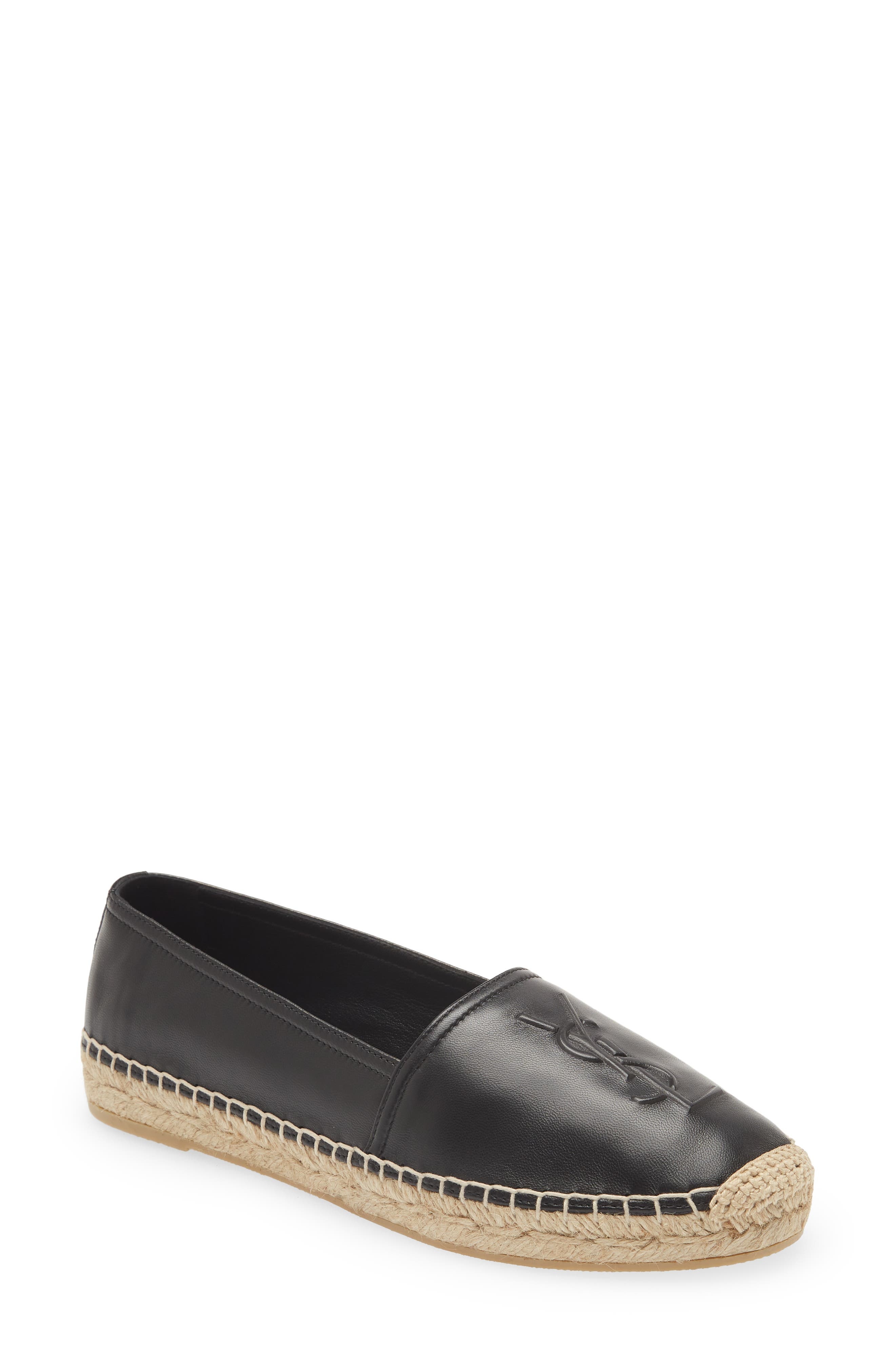 An embossed logo rises out of the smooth leather upper of this espadrille-inspired flat to deliver iconic style. Leather upper and lining/synthetic sole Made in Spain Women's Designer Shoes