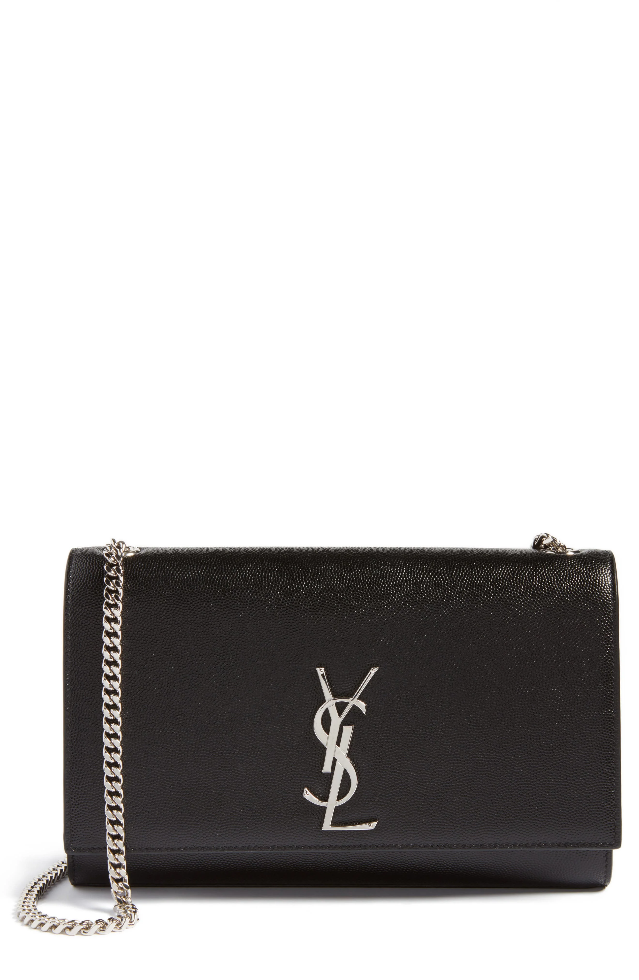 A monogrammed insignia makes an iconic mark on a pristine bag expertly crafted in Italy from pebbled calfskin and suspended from a striking chain strap. Magnetic-flap closure Pull-through chain strap Interior wall pocket Leather Made in Italy Designer Handbags