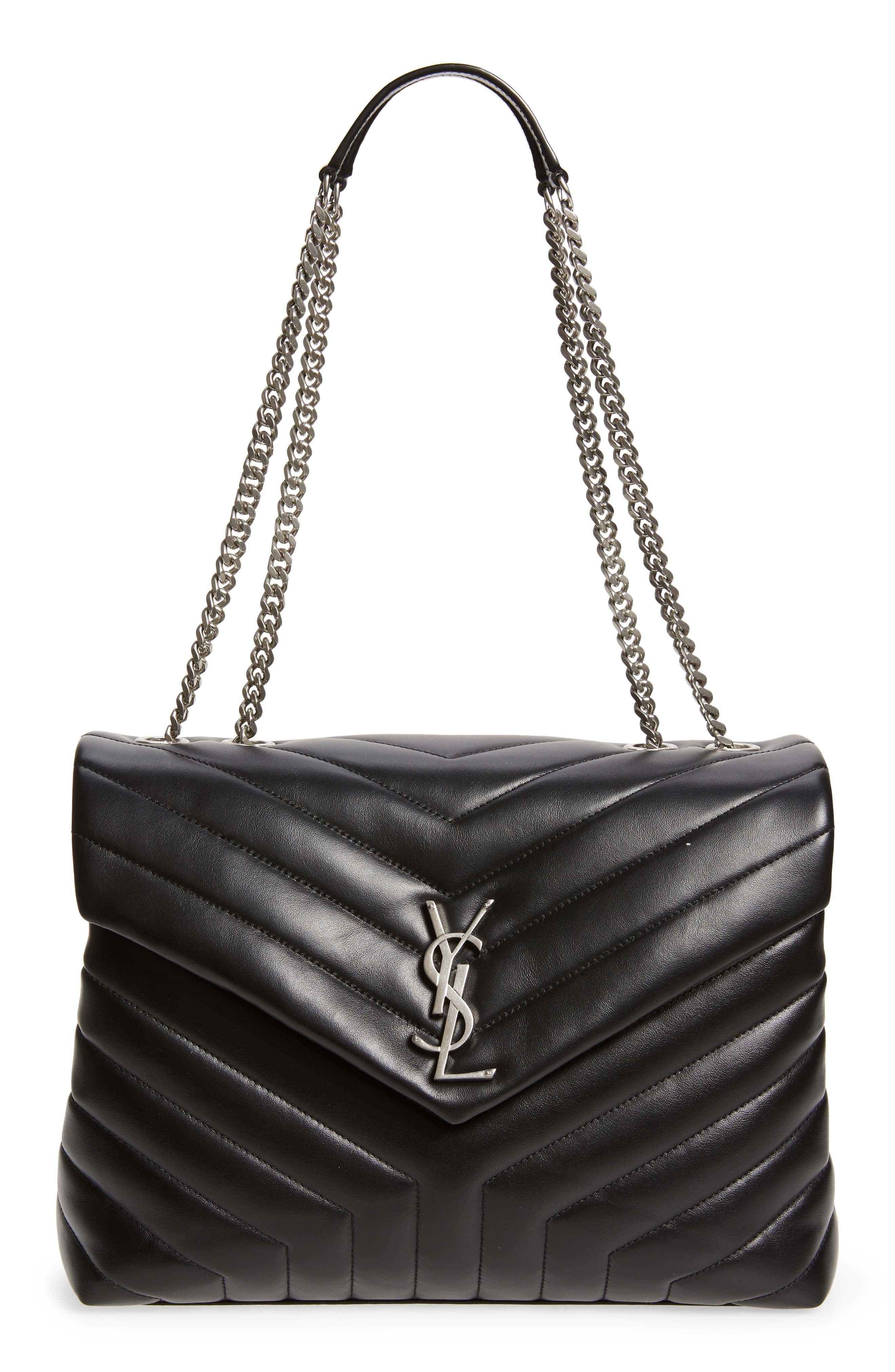 Silvery hardware shines against the creamy quilted leather of a signature shoulder bag featuring a spacious divided interior and pull-through straps. Magnetic snap-flap closure Pull-through chain strap Divided interior with zip pockets Calfskin leather Made in Italy Designer Handbags