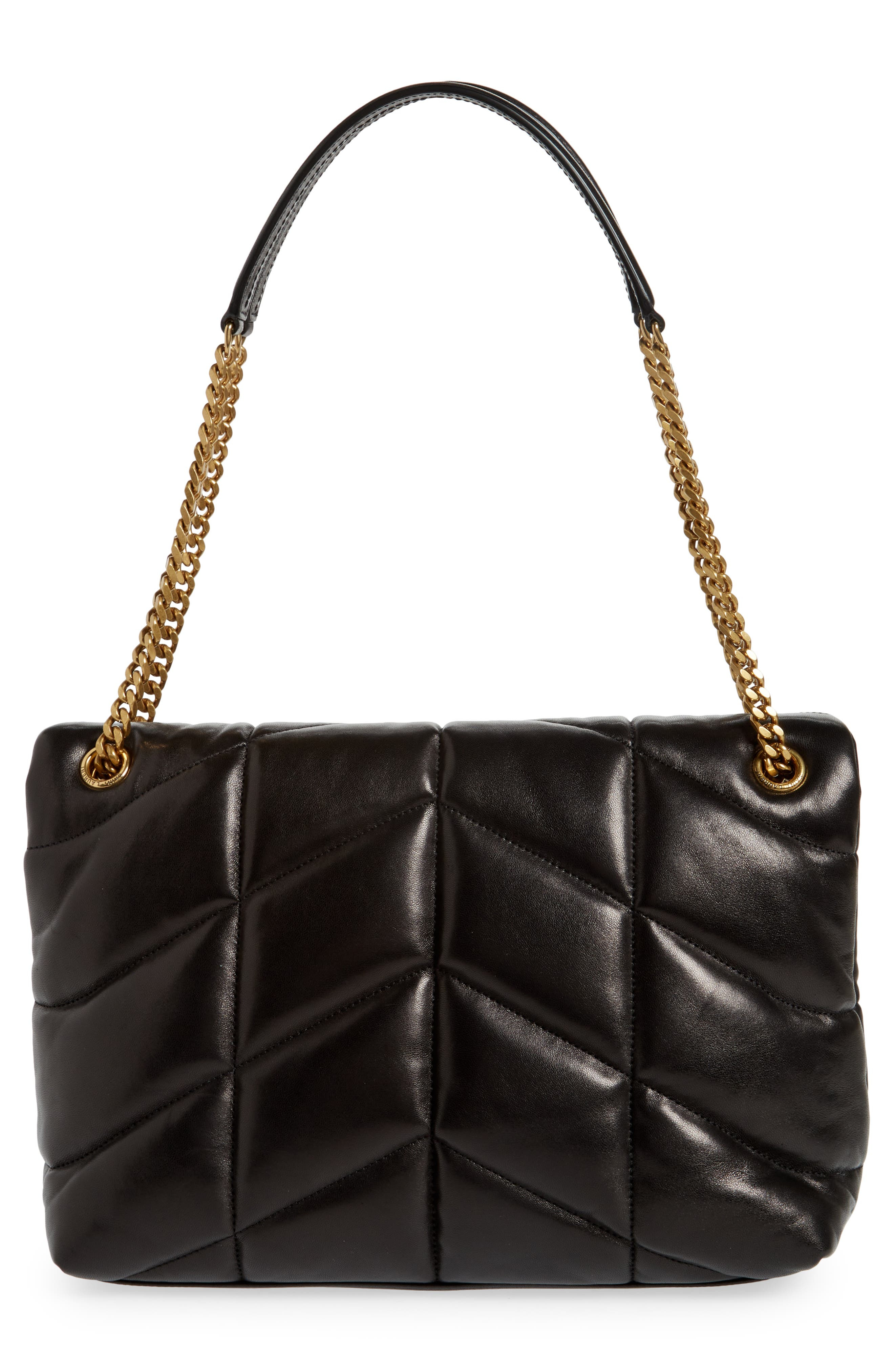 Inspired by a puffer jacket, chevron quilting with lavish padding brings eye-catching dimension to a calfskin bag named for founder Yves Saint Laurent's muse. A monogram insignia adds a signature flourish to the look, which is equipped with a pull-through strap that offers styling versatility. Magnetic-snap flap closure Pull-through strap Interior zip pocket Lined Leather Made in Italy Designer Handbags