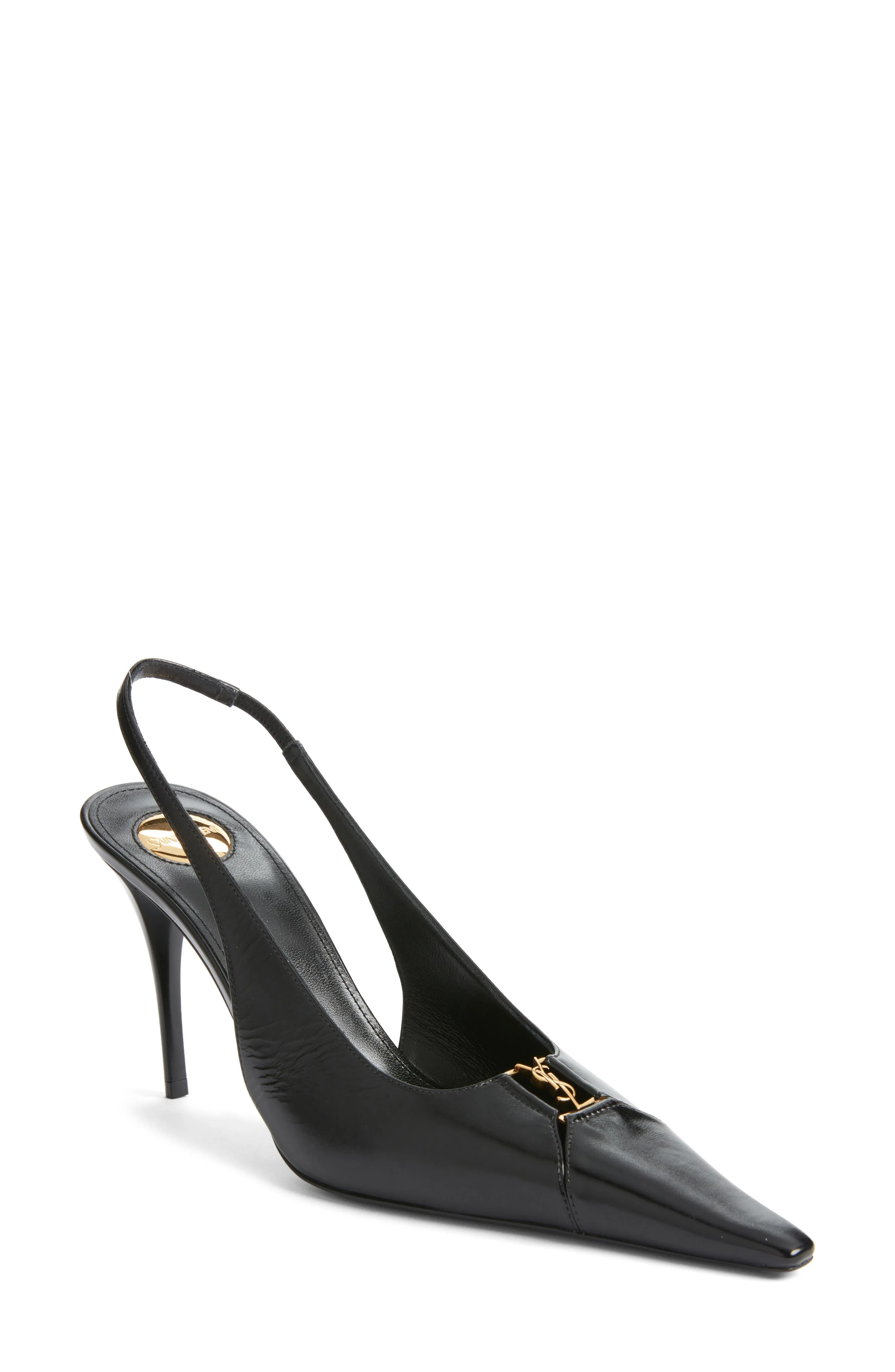 Signature Cassandre hardware shines at the cutout of this sleek leather slingback pump sharpened with a stiletto heel and elongated toe. 3 1/2" (90mm) heel Elasticized slingback strap Leather upper, lining and sole Made in Italy Designer Shoes