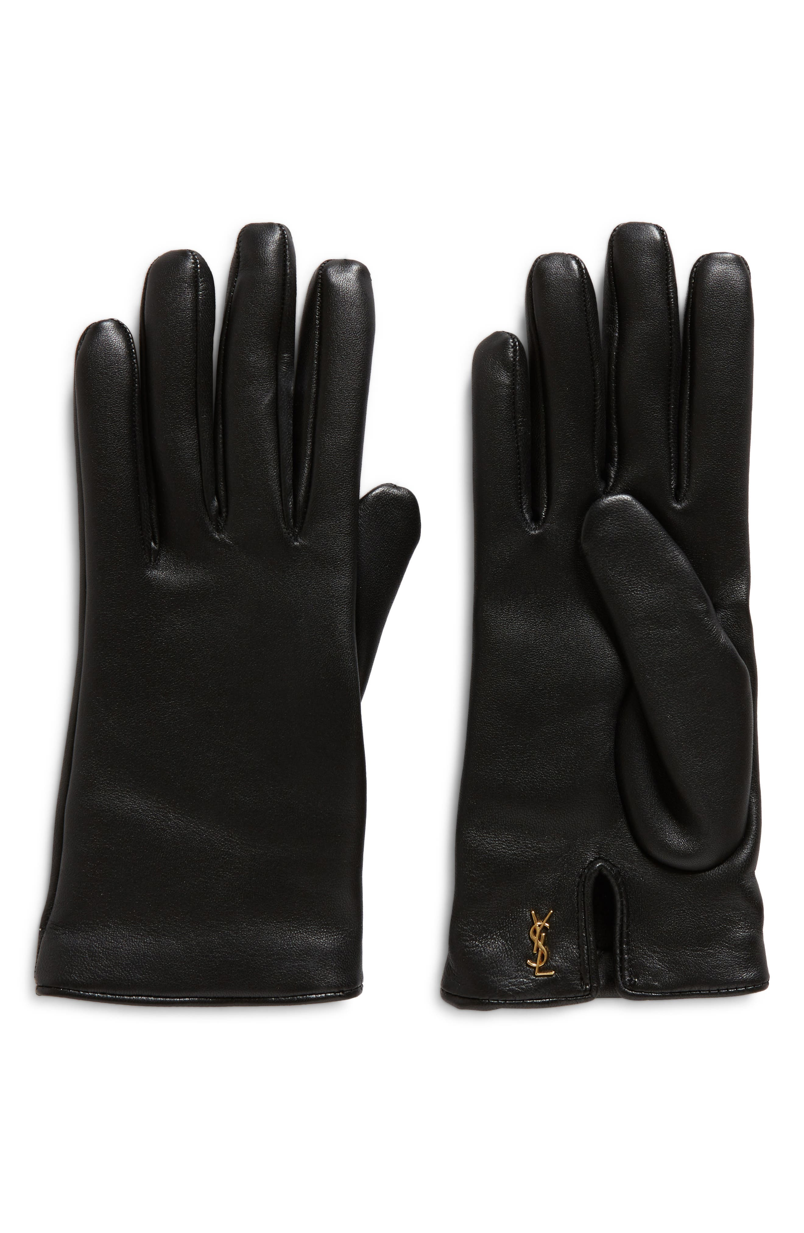 Saint Laurent Cassandre Logo Cashmere Lined Leather Gloves in Black/Gold at Nordstrom