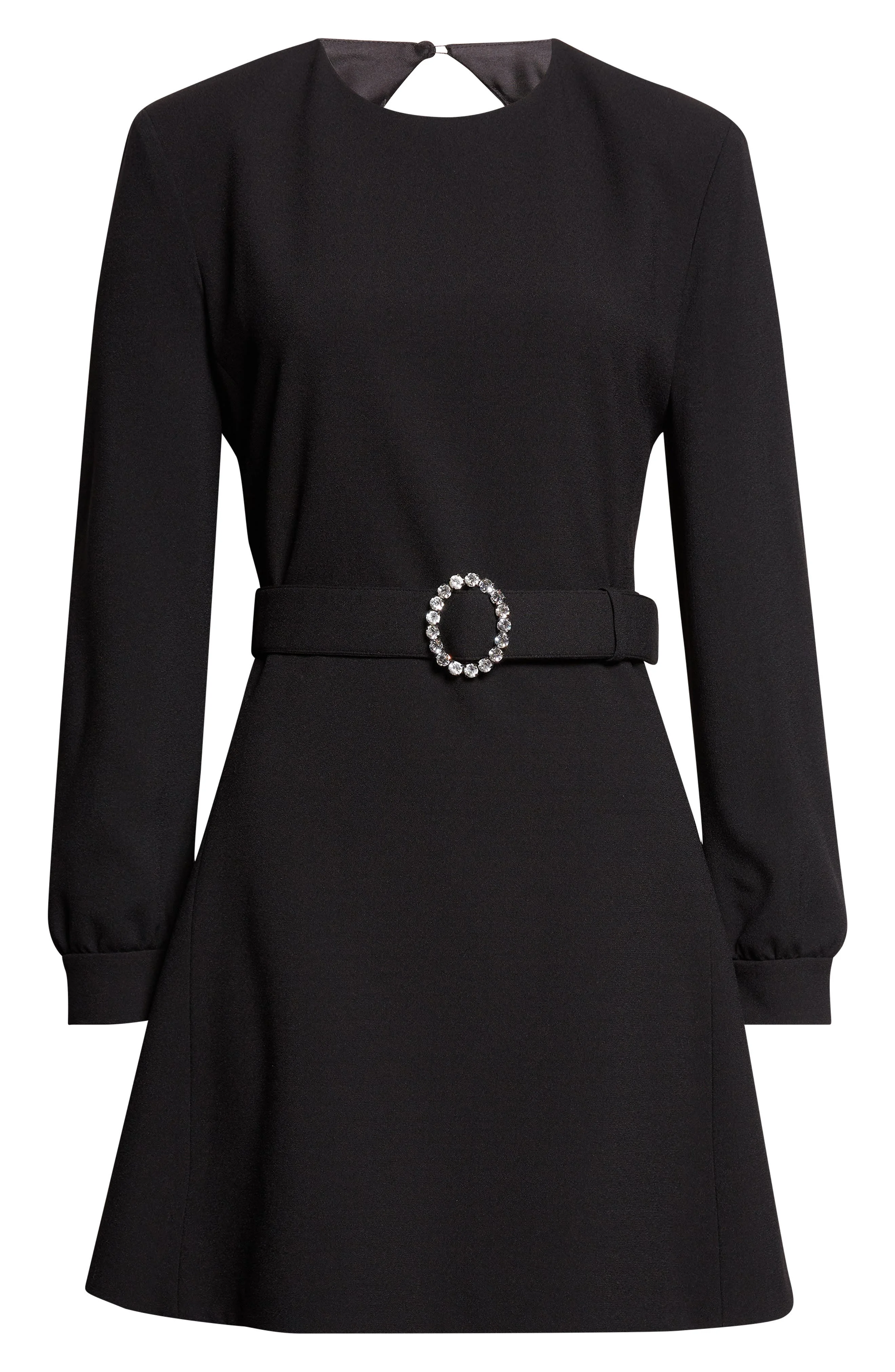 This sleek long-sleeve minidress creates unexpected drama with a diamond-shaped open back and is cinched at the waist with a chic belt centered by a round crystal-studded buckle. Hidden back zip; open back with button-and-loop closure Jewel neck Long sleeves Padded shoulders Removable belt Lined 53% acetate, 47% viscose Dry clean Made in Italy Designer Clothing