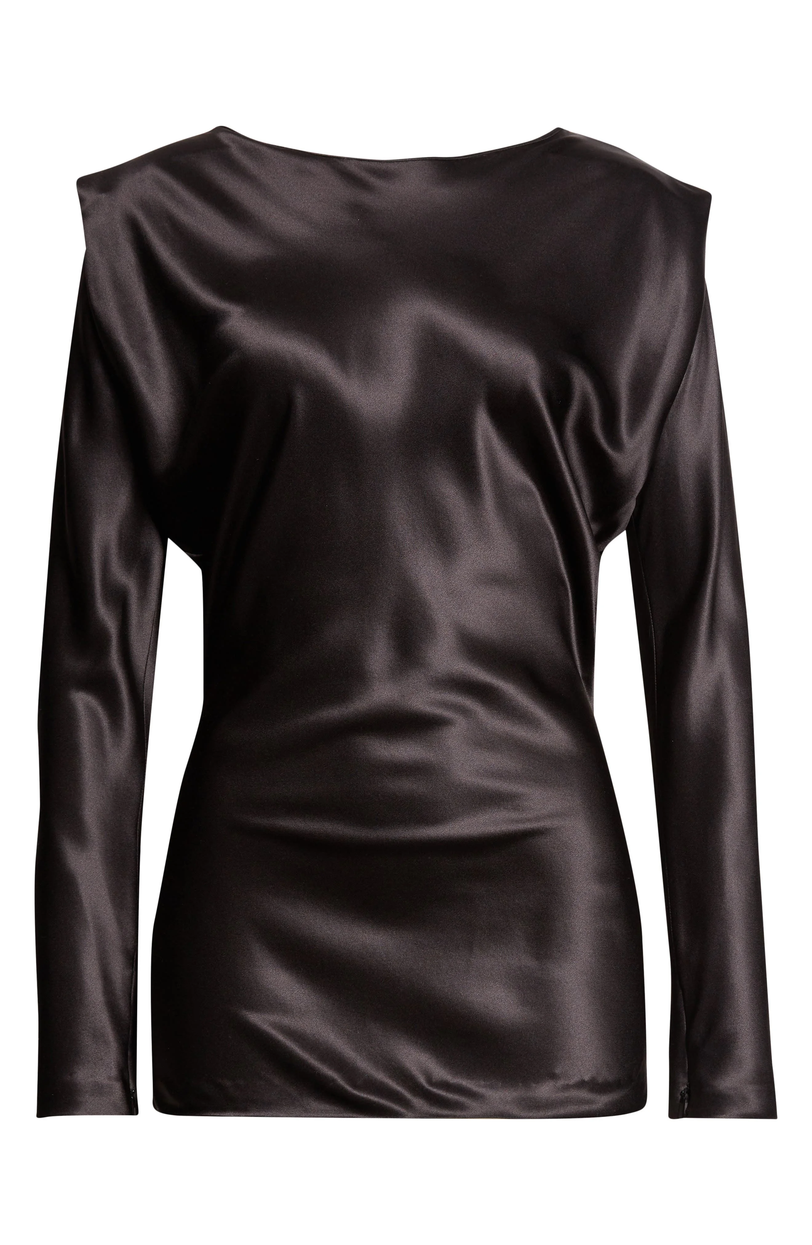 Designed to play with light as it cuts a striking silhouette, this silk-satin top is tailored broad through the shoulders and then languidly tapers through the sleeves and elongated torso. Bateau neck Long sleeves 100% silk Dry clean Made in Italy Designer Clothing