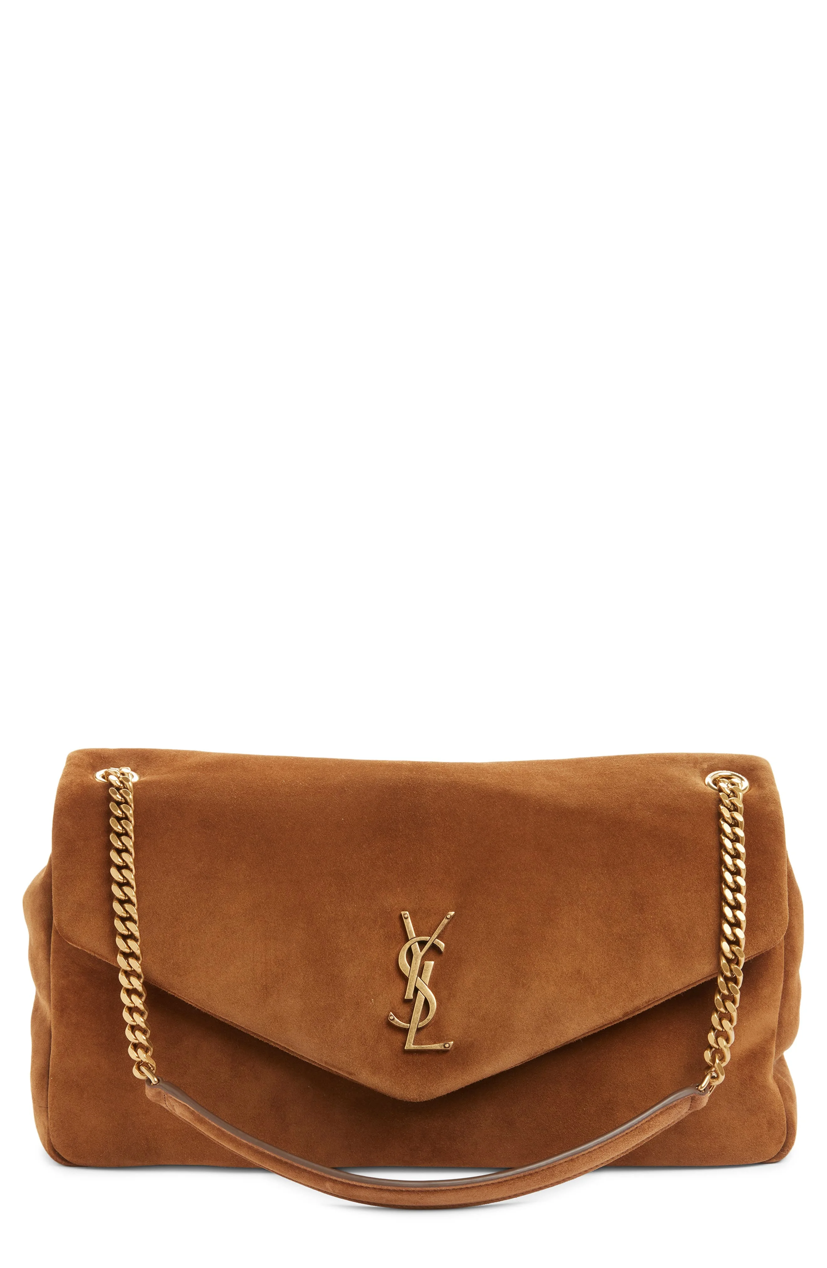 An iconic YSL insignia brands the flap of this calfskin-suede bag designed in a softly structured silhouette with a pull-through strap for carrying versatility. Magnetic-snap flap closure Pull-through chain-and-leather strap Interior zip pocket Leather Made in Italy Designer Handbags