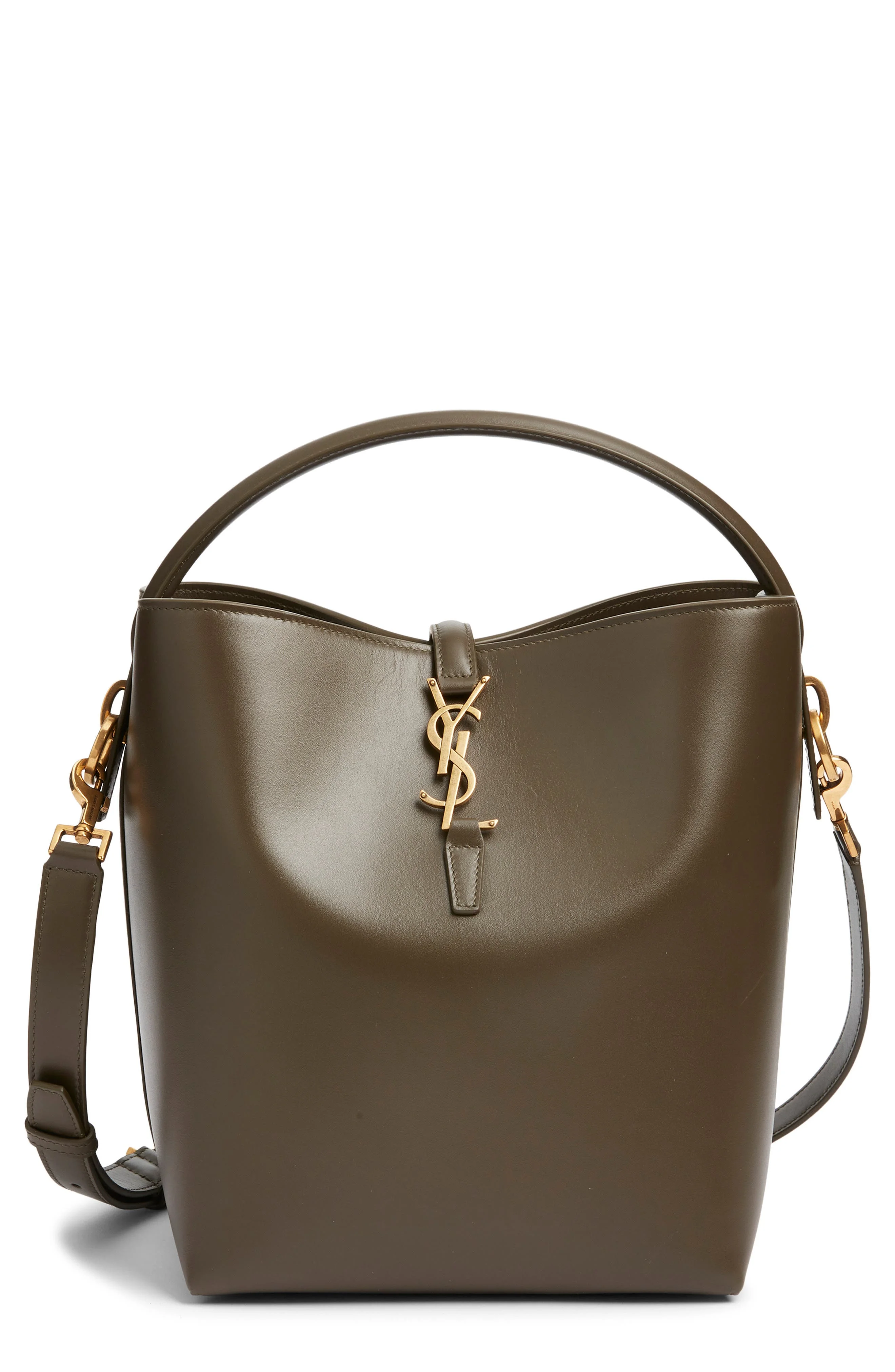 Done in smooth calfskin and branded with YSL insignia, this aptly named bucket bag takes you from dawn to dusk (and beyond) with ample room for the essentials. Hook tab closure Top carry handle; removable, adjustable crossbody strap Structured silhouette with flat base and protective metal feet Leather Made in Italy Designer Handbags