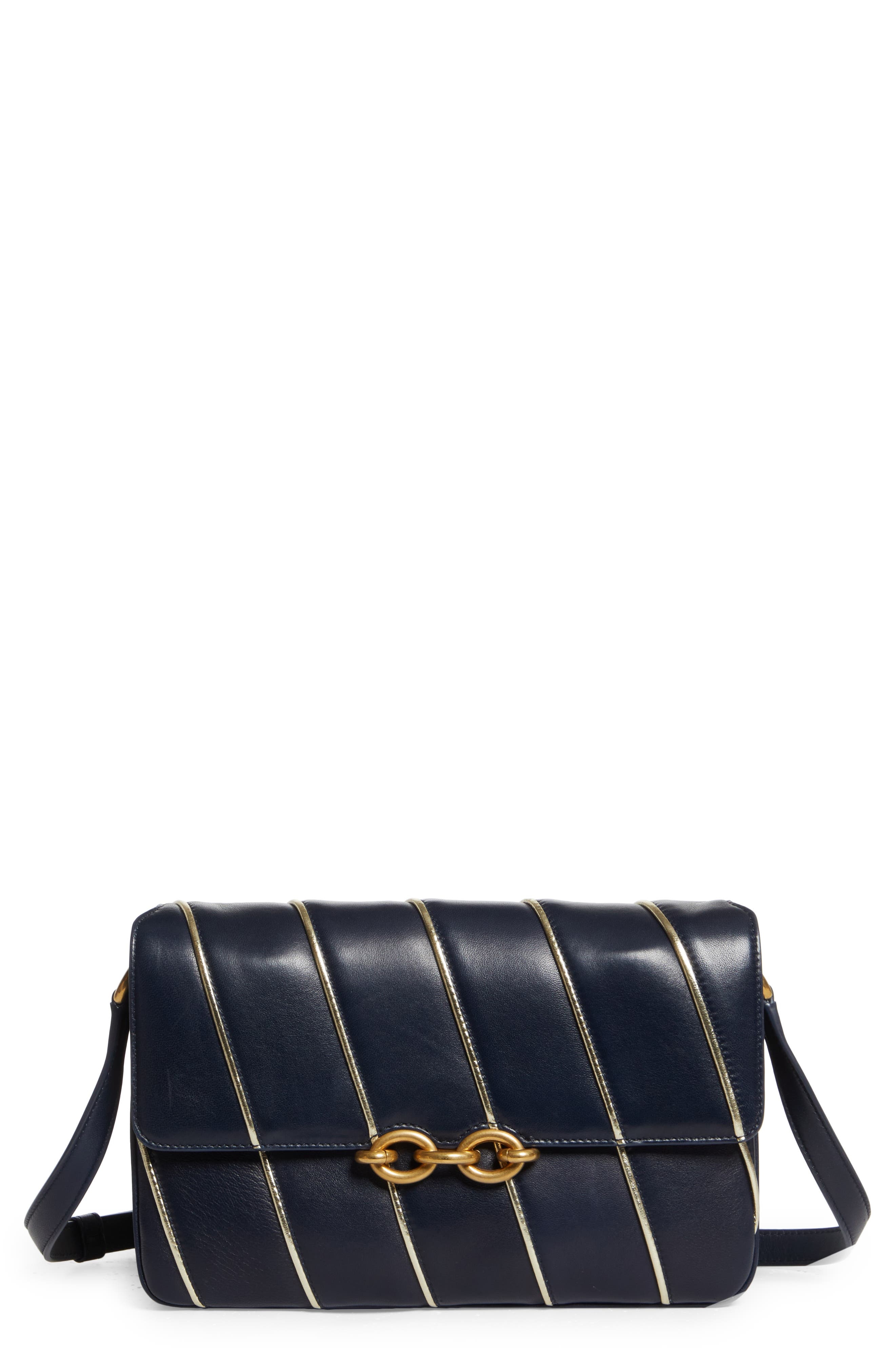 A goldtone cable-link chain ornaments the flap of a structured shoulder bag crafted of supple lambskin leather with angled godltone piping. Magnetic-snap flap closure Adjustable shoulder strap Dual interior compartments with center divider; zip and wall pockets Leather lining Leather Made in Italy Designer Handbags