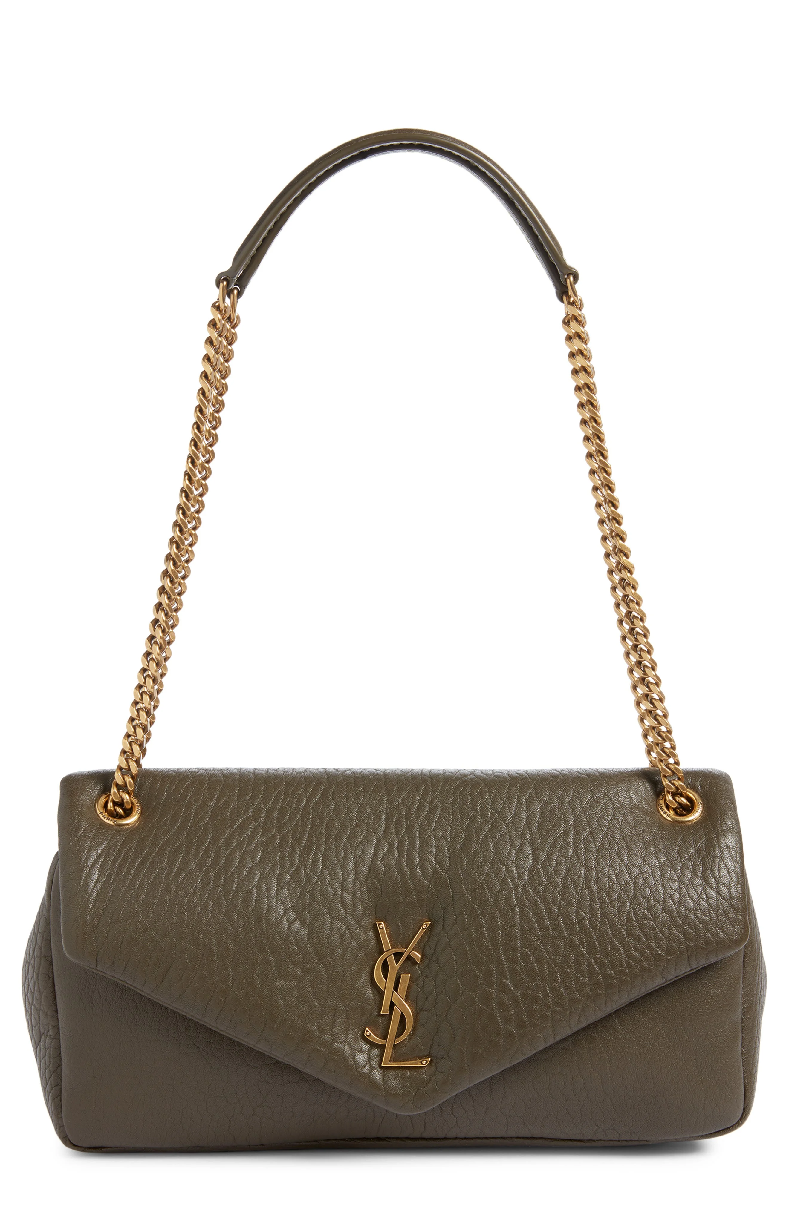 Iconic YSL hardware brands the envelope-style flap of this lambskin-leather bag designed in a puffy, pillowed-effect silhouette with a pull-through chain strap for carrying versatility. Magnetic-snap flap closure Pull-through chain strap Interior zip pocket Cotton-grosgrain lining Leather Made in Italy Designer Handbags