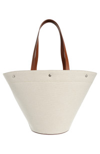Unbleached canvas made of cotton and linen furthers the casual, go-everywhere appeal of this shapely tote fronted by bold logo lettering. Open top Top carry handles; removable, adjustable crossbody strap Structured silhouette with flat base for stability Textile with leather trim Made in Italy Designer Handbags