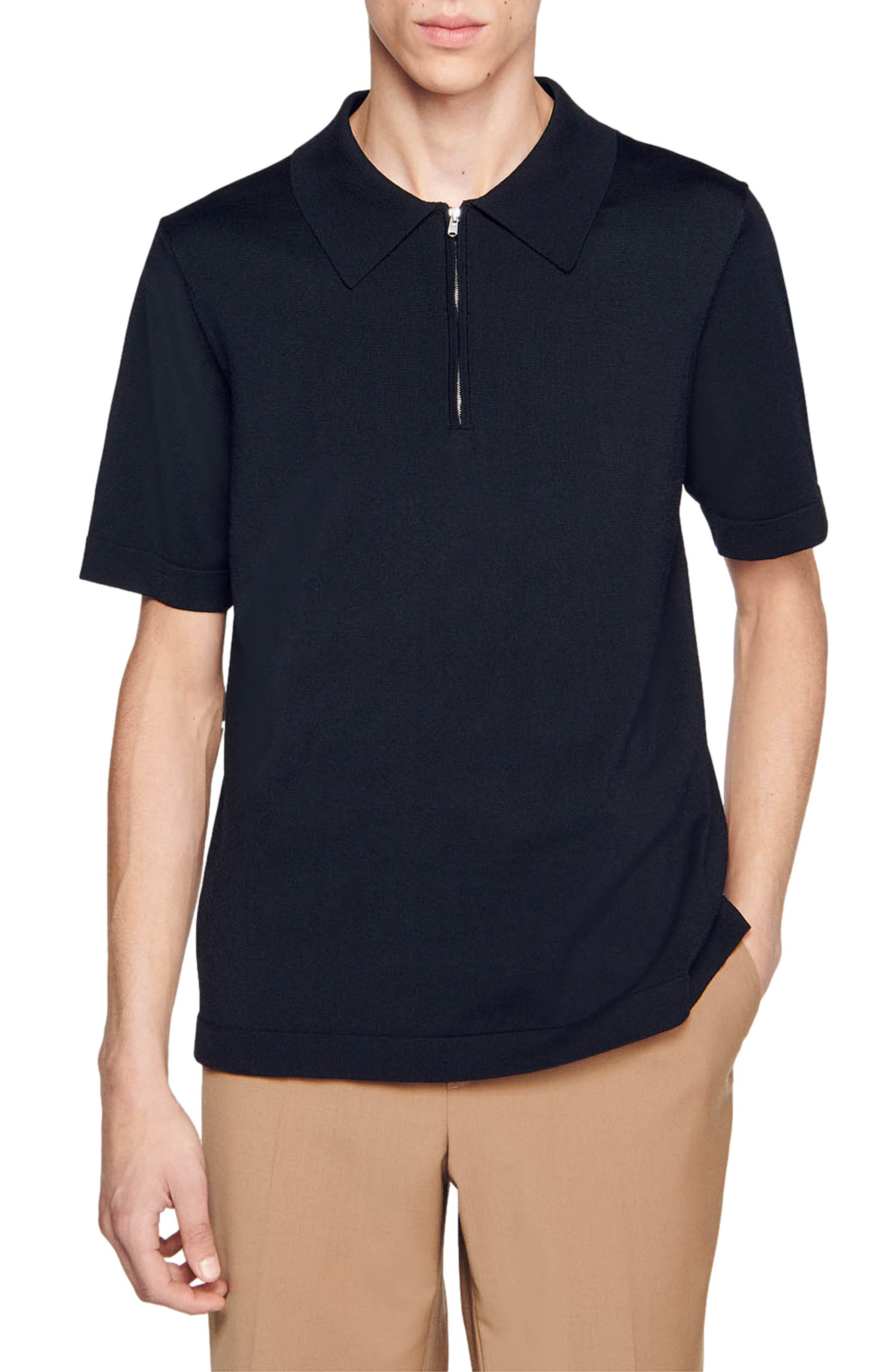 Sleek and smart, this basic-black polo sports a shallow zippered placket and a vibe that works layered or on its own. Quarter-zip closure Point collar Short sleeves 82% acetate, 16% nylon, 2% elastane Dry clean or hand wash, dry flat Imported