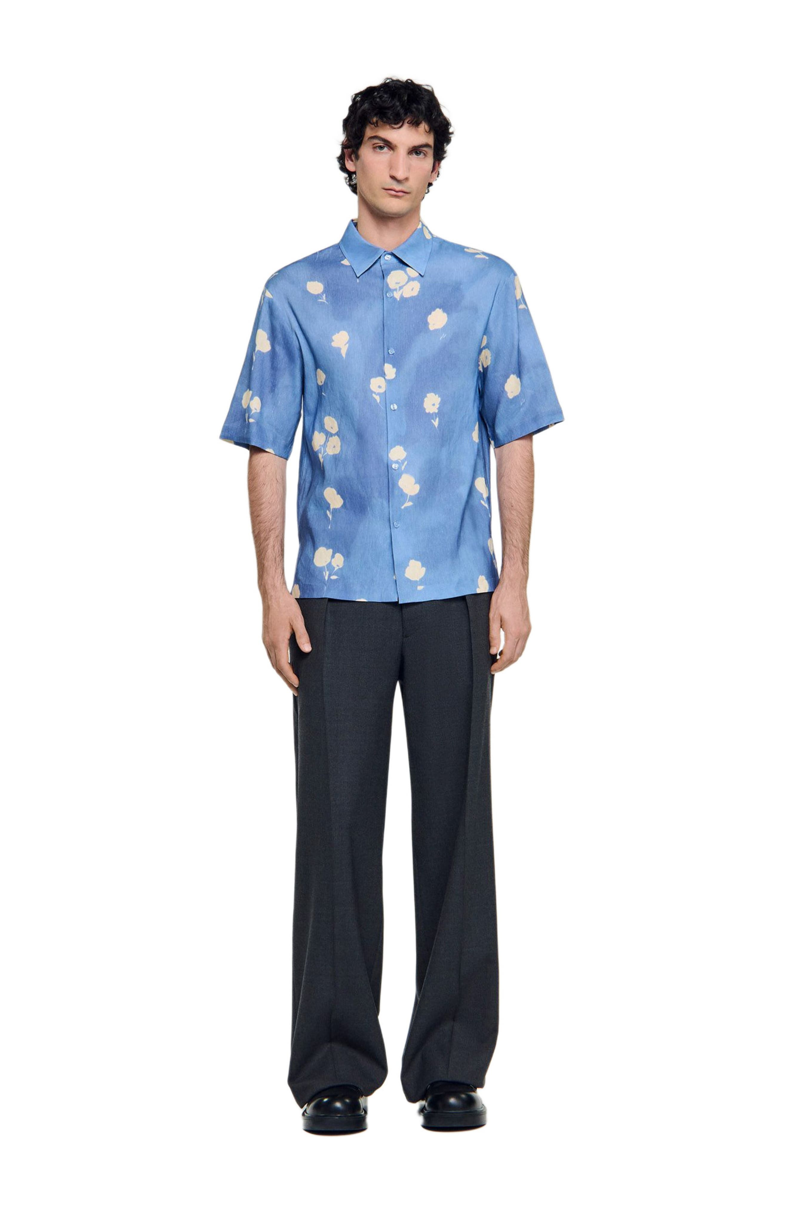 Lightweight linen shirt with floral print, featuring a classic collar, button fastening and short sleeves. Sandro Men's floral print shirt Flowing fit Classic collar Short sleeves Button fastening 63% linen The model is 6'1 tall and wears a size M