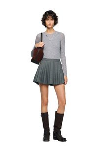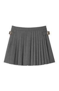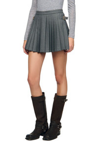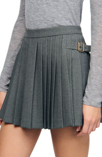 Virgin wool skort with pleats, featuring metal buckles on the sides and a back zip fastening. Sandro Women's wool skort High waist Flared cut Metal buckle on the side Back zip fastening The model is 5'9 tall and wears a size 4