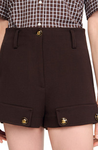 High-waisted carpenter shorts with wide belt loops, featuring decorative buttoned flaps on the front. Sandro Women's carpenter shorts High waist Back darts 2 buttoned flaps Patch pocket on back Front button fastening The model is 5'9 tall and wears a size 4
