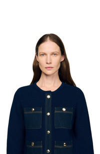 Rib knit cardigan with a round neck, long sleeves, button fastening, and adorned with patch pockets and a raw denim placket. Sandro Women's rib knit cardigan Round neck Long sleeves Front button fastening Denim patch pockets The model is 5'9 tall and wears a size small