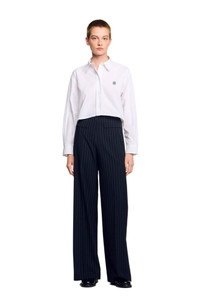 Wide-leg straight-fit trousers featuring chalk stripes, darts at the back and welt pockets. These trousers match the top Sandro Women's straight-leg trousers Chalk stripes Darts on back Pintucks Zip fastening The model is 5'9 tall and wears a size 4