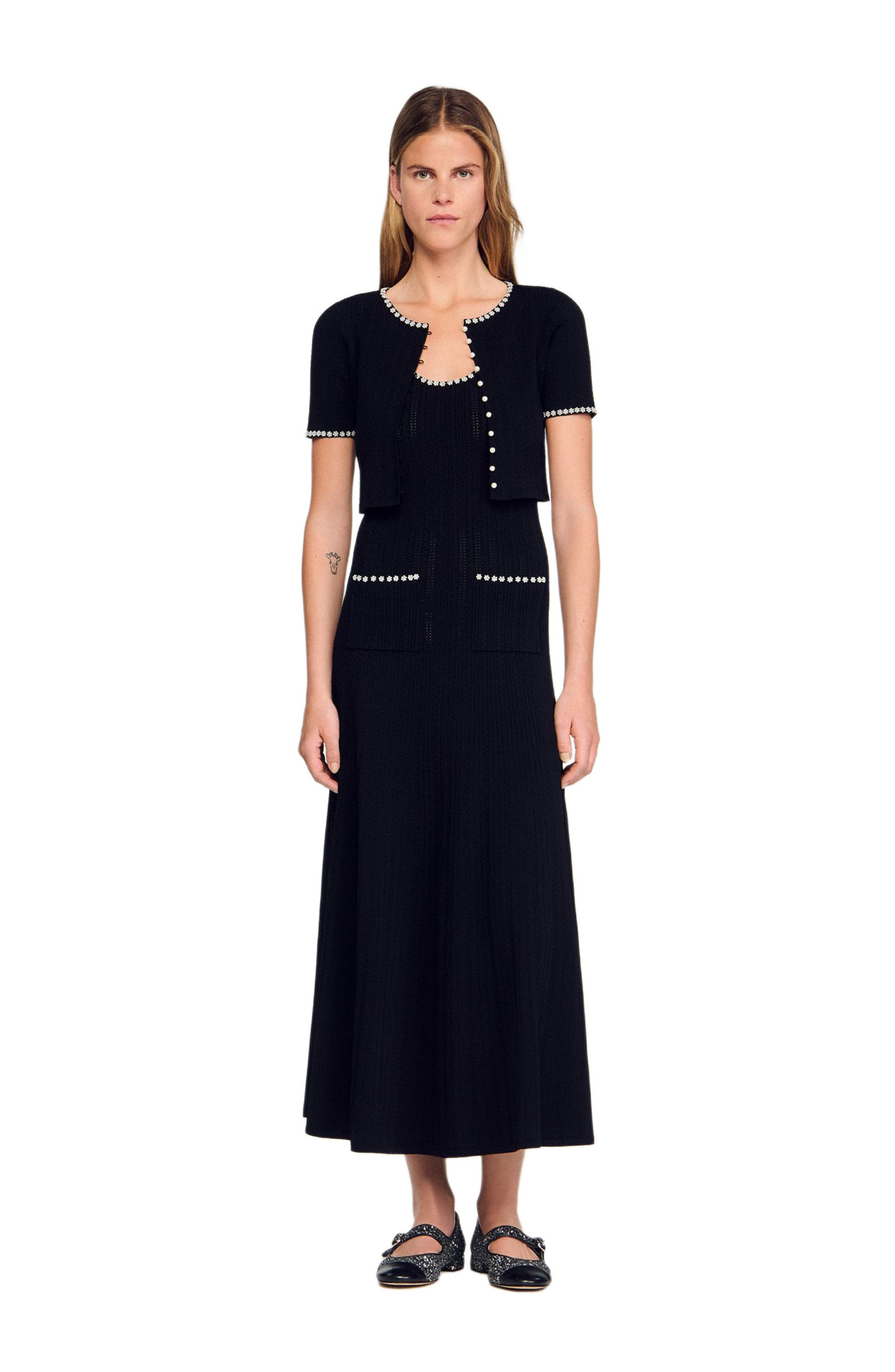Cropped cardigan with round neck, short sleeves and button fastening, adorned with contrasting embroidered pearls. Sandro Women's cropped cardigan Round neck Button fastening Short sleeves Embroidered pearls The model is 5'9 tall and wears a size small