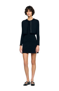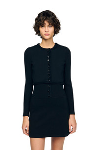 Cropped rib knit cardigan with round neck and long sleeves, with button fastening. Sandro Women's cropped cardigan Rib knit Round neck Long sleeves Front button fastening Cropped fit Fine knit The model is 5'9 tall and wears a size small