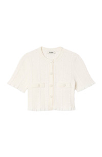 Short fancy pointelle knit cardigan with round neck, short sleeves, button fastening and front pockets. Sandro Women's cropped cardigan Short sleeves Round neck Front button fastening Ruffled trim The model is 5'8 tall and wears a size small