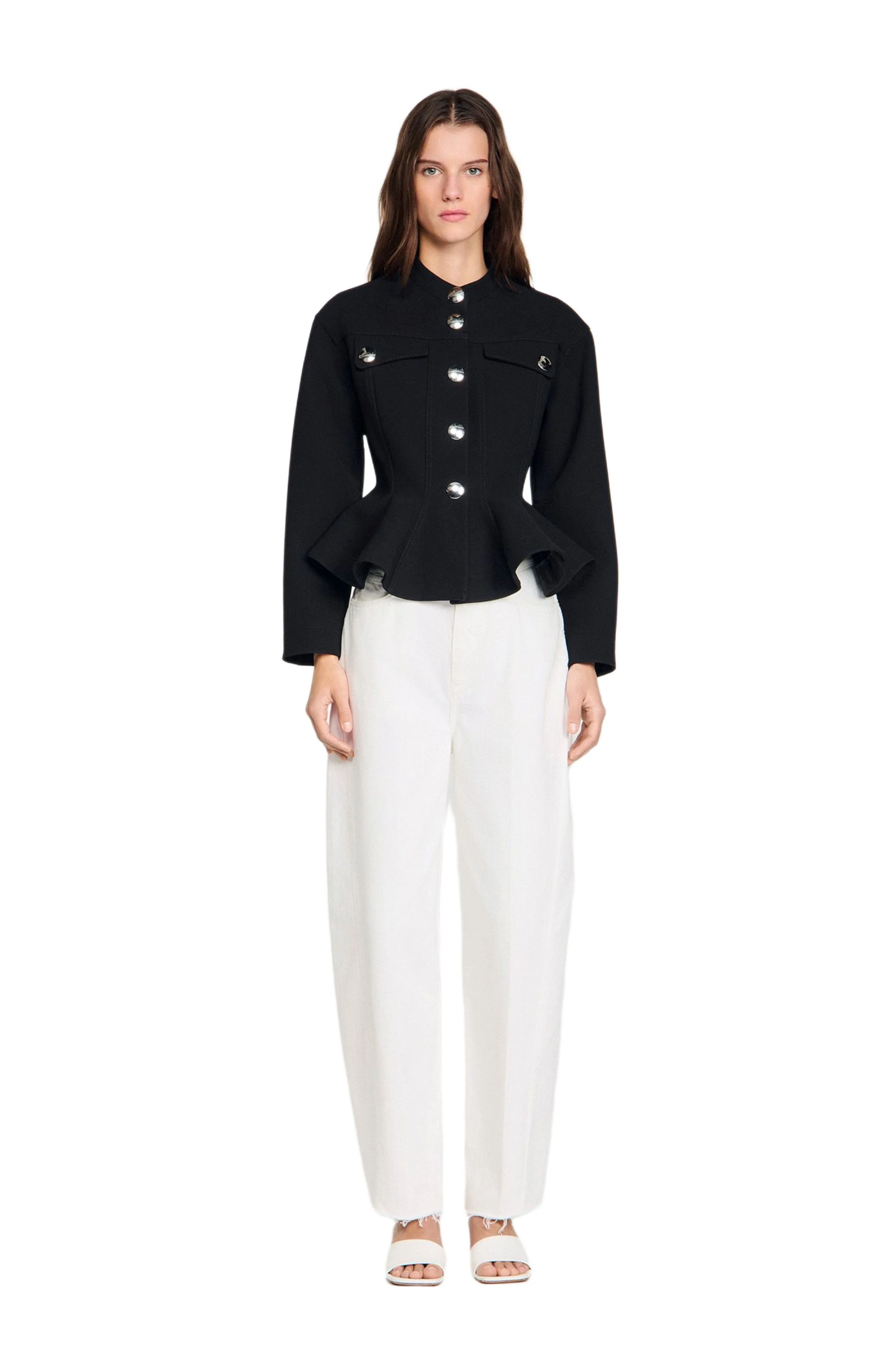Short, fitted jacket with a ruffled peplum, featuring an officer collar, long sleeves, a press-stud fastening, and chest pockets. Sandro Women's short jacket Fitted cut with ruffled peplum Officer collar Long sleeves Front metal press-stud fastening Press-stud pocket flaps The model is 5'8 tall and wears a size 4