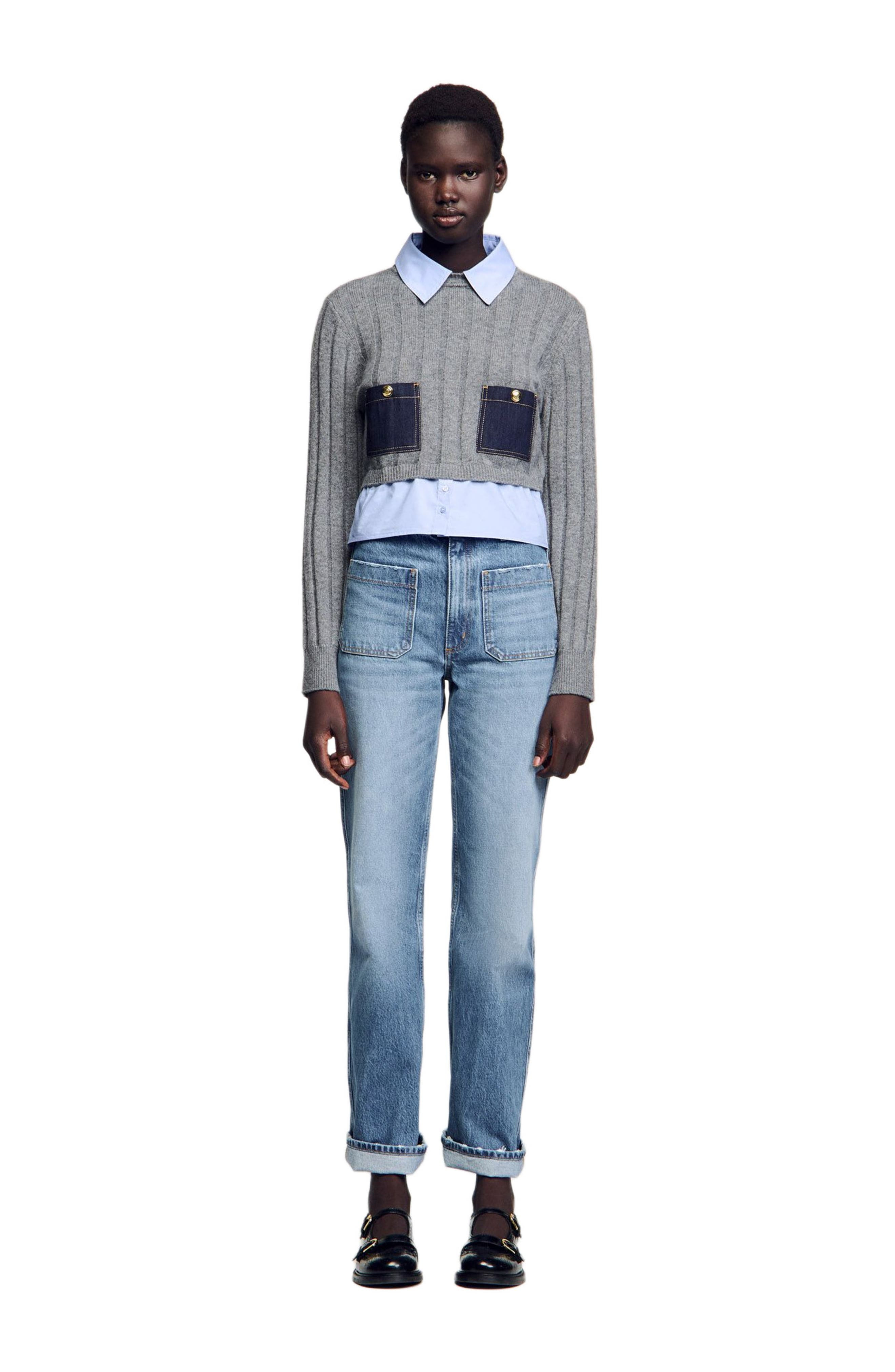 Cropped wool and cashmere knit sweater with shirt panels, long sleeves and denim patch pockets. Sandro Women's knitted wool and cashmere jumper Contrasting shirt collar Long sleeves 2 denim patch pockets with buttons Shirt hem The model is 5'8 tall and wears a size 1