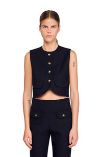 Sleeveless fine knit crop top with a button fastening at the front, round neck, flap patch pockets and a rounded hem at the front. Sandro Women's plain crop top Sleeveless Round neck Button fastening at the front Flap patch pockets The model is 5'9 tall and wears a size small