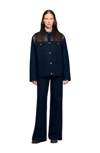 Quilted jacket in raw denim and contrasting leather, featuring a shirt collar, long sleeves with buttoned slits, and a button placket fastening. Sandro Women's raw denim jacket Leather collar and panels Long sleeves with buttoned slits Topstitched pockets with buttoned flap on chest Large patch pockets with welt pocket The model is 5'9 tall and wears a size 4