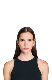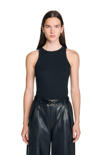 Vest top with round neck and American-style armholes, embellished with embroidery on the chest. Sandro Women's vest top American armholes Round neck SANDRO embroidery The model is 5'8 tall and wears a size 1