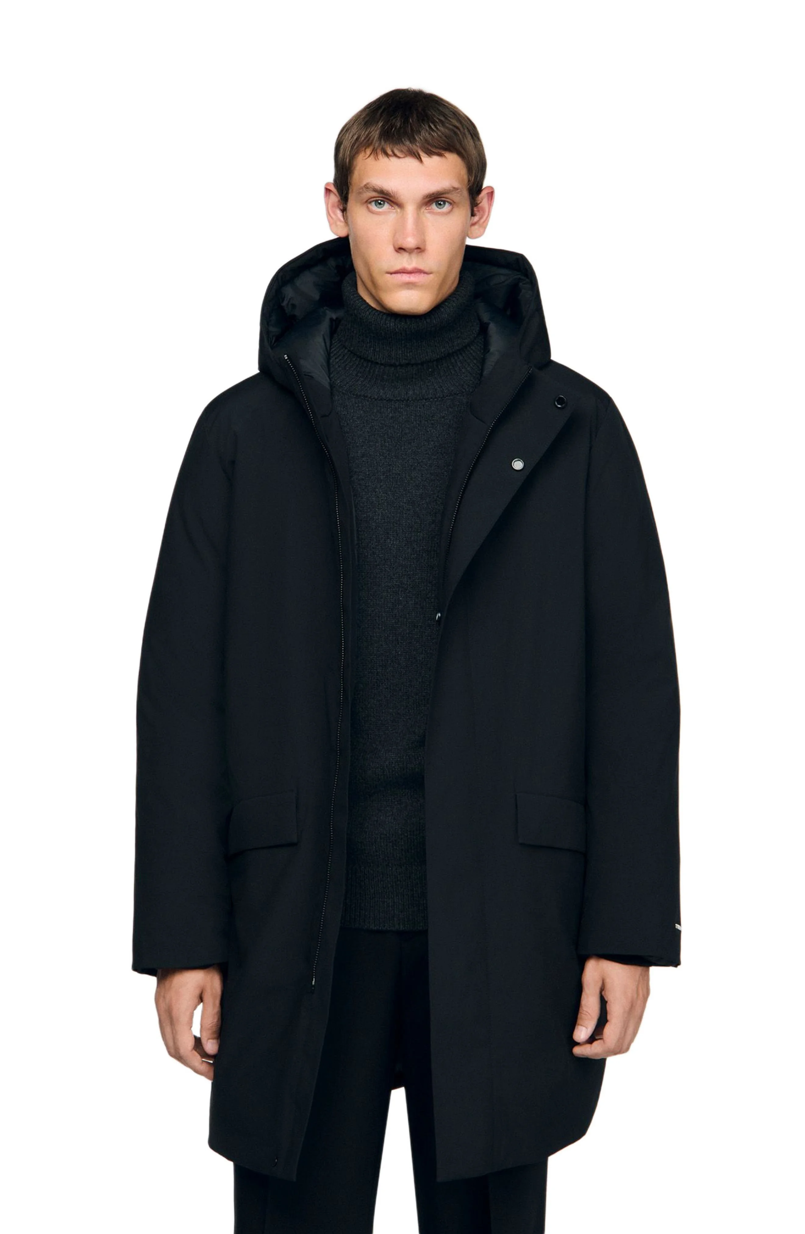 Quilted parka with zip fastening and press studs, hood and front flap pockets. Sandro Men's parka Stand-up collar Long sleeves Hood Zip fastening with hidden press studs Front flap pockets Inner lining with pockets The model is 6'1 tall and wears a size M