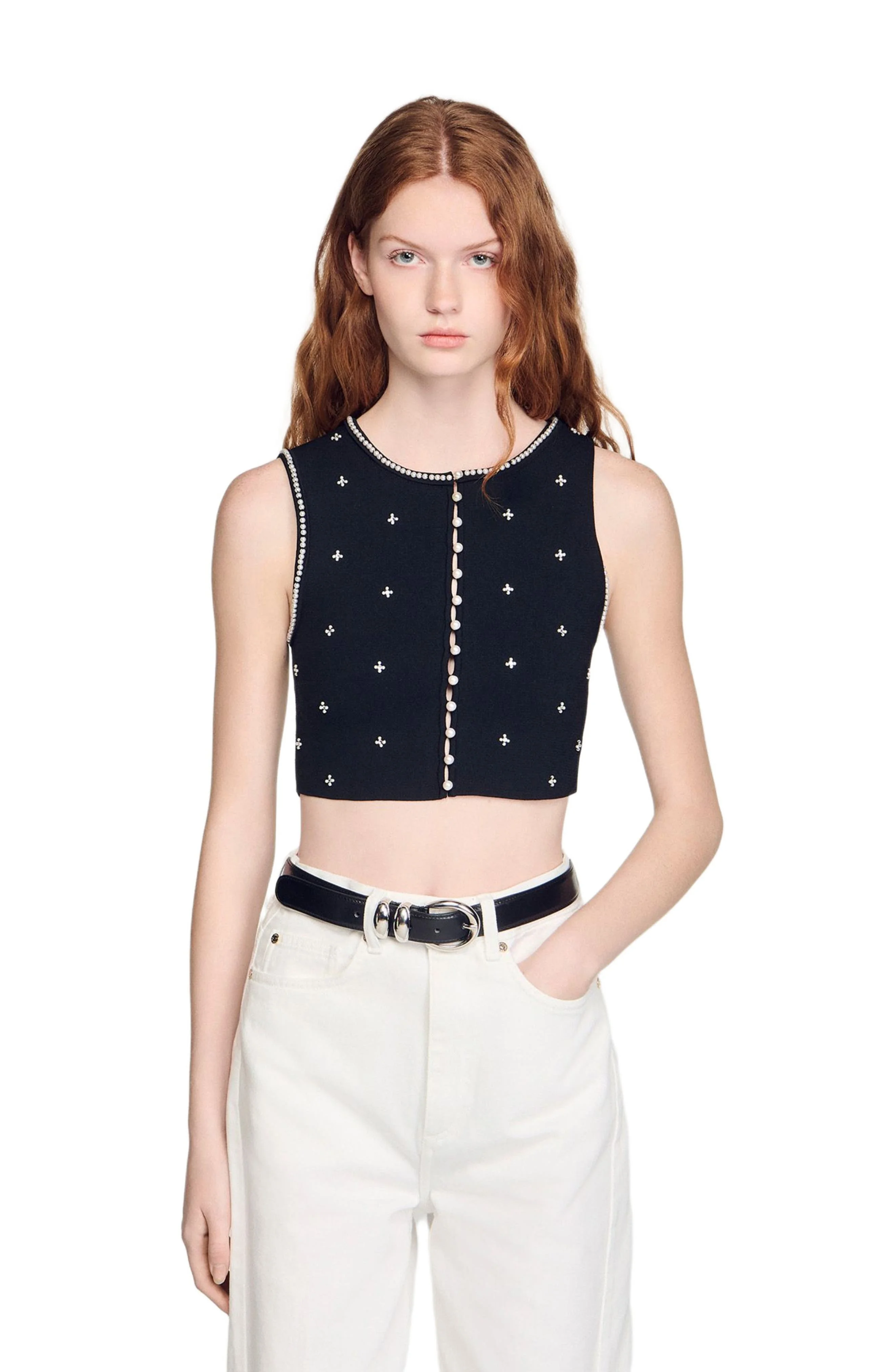 Sleeveless cropped knit top with a round neck, embellished with embroidered rhinestones and pearl buttons. Sandro Women's cropped top Cropped fit Embroidered rhinestones Round neck Sleeveless Front button fastening with pearl buttons The model is 5'11 tall and wears a size small