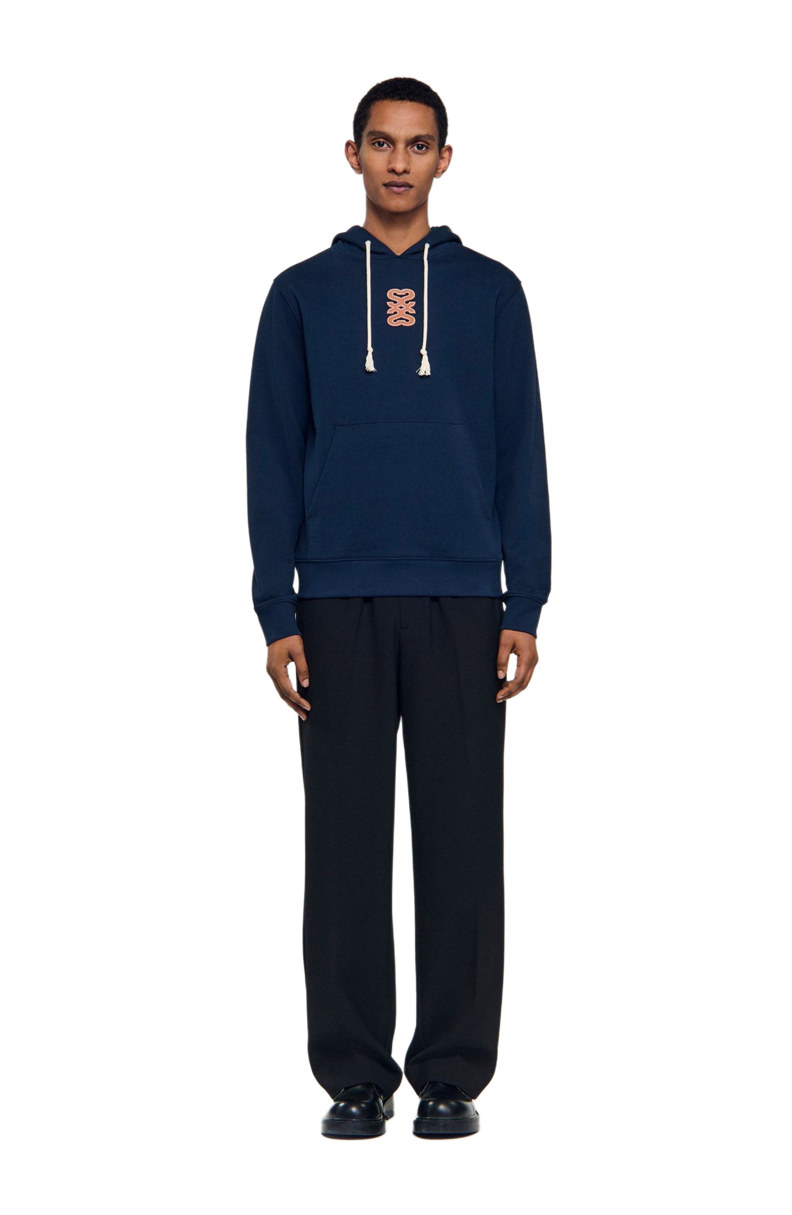 Oversized sweatshirt in non-brushed fleece, with a hood with braided drawstrings, long sleeves, a front pocket and a leather 4S patch on the front. Sandro oversized sweatshirt Hood with braided drawstrings Long sleeves Leather 4S patch Kangaroo pocket Ribbed cuffs and waist The model is 6'1 tall and wears a size M