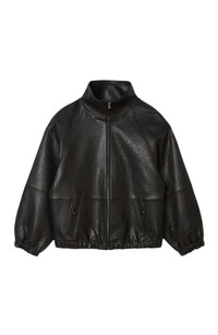 Oversized bubble leather jacket with stand-up collar, zip fastening, long sleeves and side pockets. Sandro Women's leather jacket Oversized fit Raglan sleeves Long sleeves Stand-up collar Zip fastening Welt pockets Elasticated cuffs and hem The model is 5'8 tall and wears a size 36