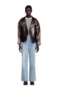 Oversized leather jacket with suit-style lapel collar, wrap design with covered buttons and front slash pockets. Sandro Women's leather jacket Long sleeves Suit-style lapel collar Wrap style Covered buttons Slash front pockets The model is 5'9 tall and wears a size 4