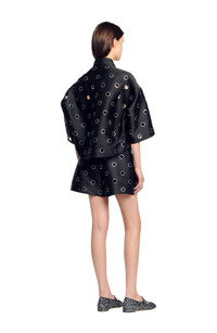 Oversized short-sleeved shirt with a shirt collar and front button fastening, embellished with all-over rhinestone holes and an asymmetric hem. Sandro Women's oversized shirt Short sleeves Shirt collar Button fastening Rhinestone holes Asymmetric hem The model is 5'8 tall and wears a size small