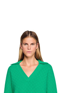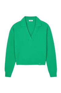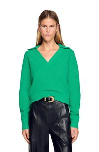 Fine knit sweater with polo collar and V-neck, featuring a geometric checkerboard pattern. Sandro Women's fine knit jumper Polo collar with V-neck Long sleeves Ribbed trim Tone-on-tone 4S embroidery The model is 5'9 tall and wears a size small