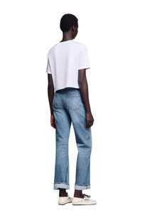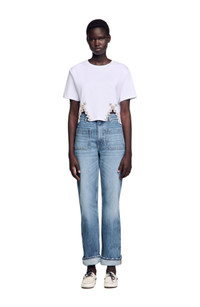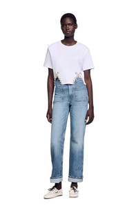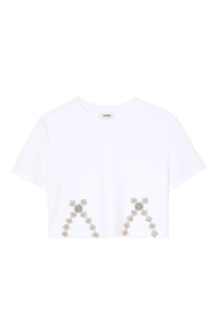 Short T-shirt with round neck, long sleeves, small front slits and embellished with floral crystals. Sandro Women's cropped T-shirt Round neck Short sleeves Front slits Crystal embroidery The model is 5'8 tall and wears a size 1