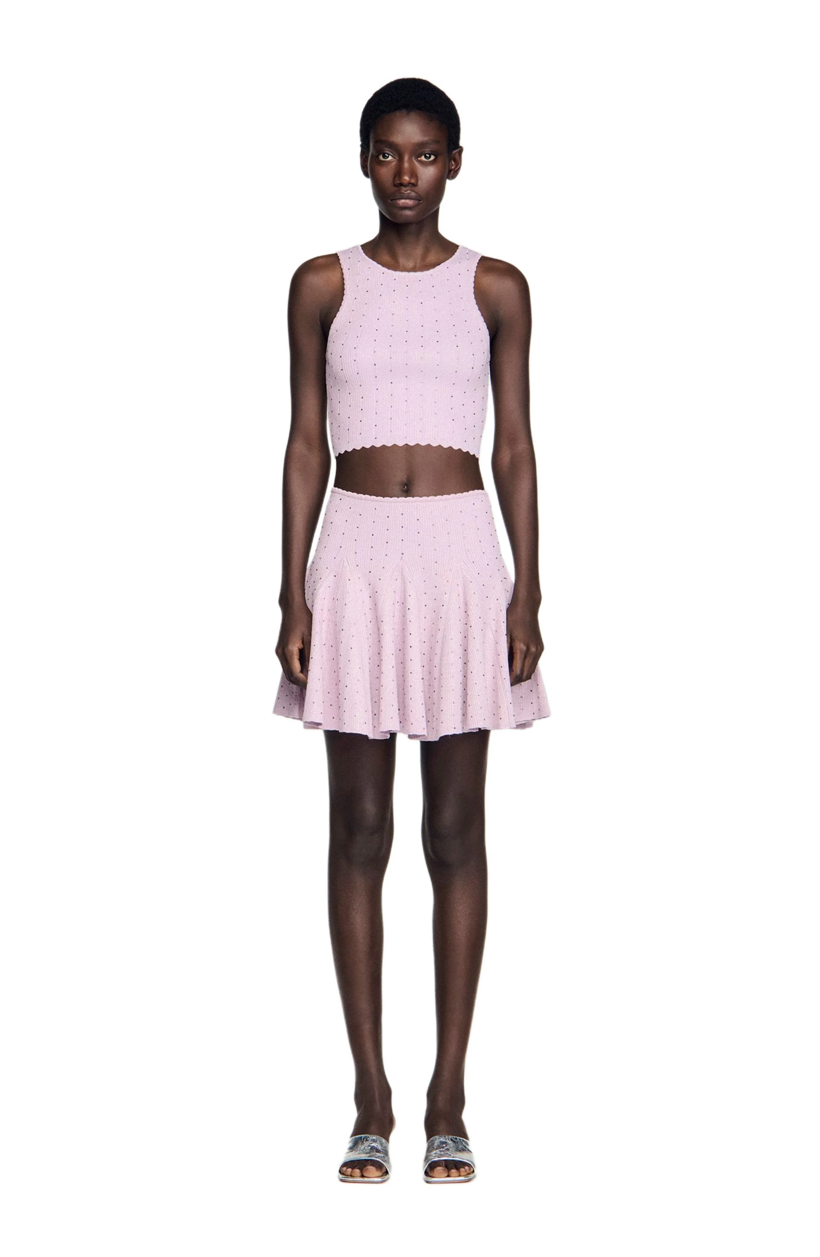 Sleeveless rhinestone-embellished knit crop top with round neck and cocotte stitch finish. Sandro Women's rhinestone-embellished knit crop top Cropped fit Round neck Sleeveless Cocotte stitch finish The model is 5'11 tall and wears a size small